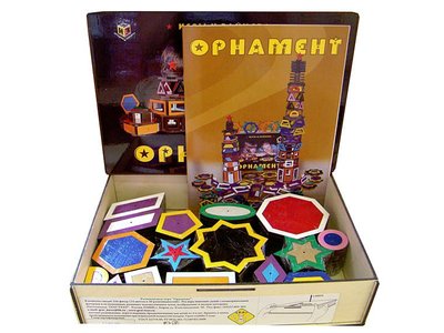 Игровое пособие «Орнамент». Состоит из 256 фигур 30 разновидностей и 12 цветов. Это не только набор геометрии, но и всевозможный конструктор, который можно использовать даже в начальных классах школы. Пособие выполнено в виде набора рамок и вкладышей. Данная игра охватывает широкий диапазон знаний и навыков, побуждают интерес к новым знаниям, дает возможность воплотить фантазию малыша и все его идеи. Развивает восприятие формы и цвета, стимулирует воображение и творческие способности ребенка.