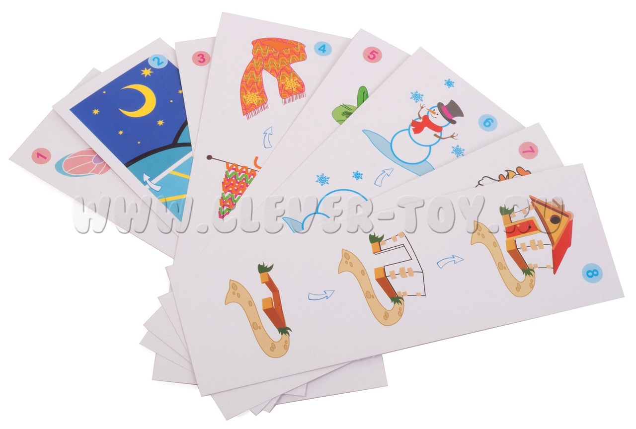 • 4 двусторонних игровых карточек с заданиями. (16*5 см);