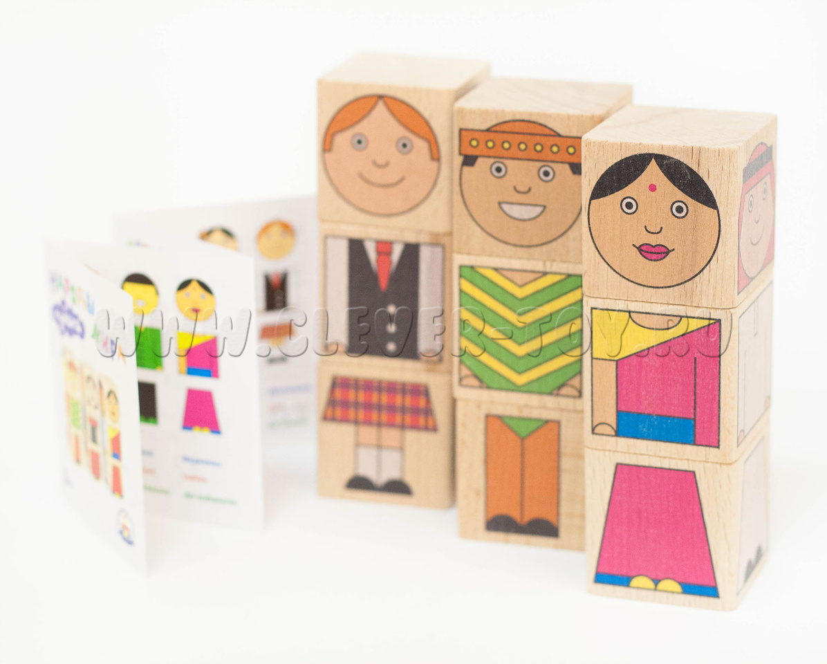 В комплект входит 9 деревянных кубиков. На 4-х гранях каждого кубика нанесена яркая картинка – часть тела забавных человечков разных национальностей. Картинки расположены таким образом, что можно ставить кубики друг на друга, чтобы получался вертикальный «кубический человечек».