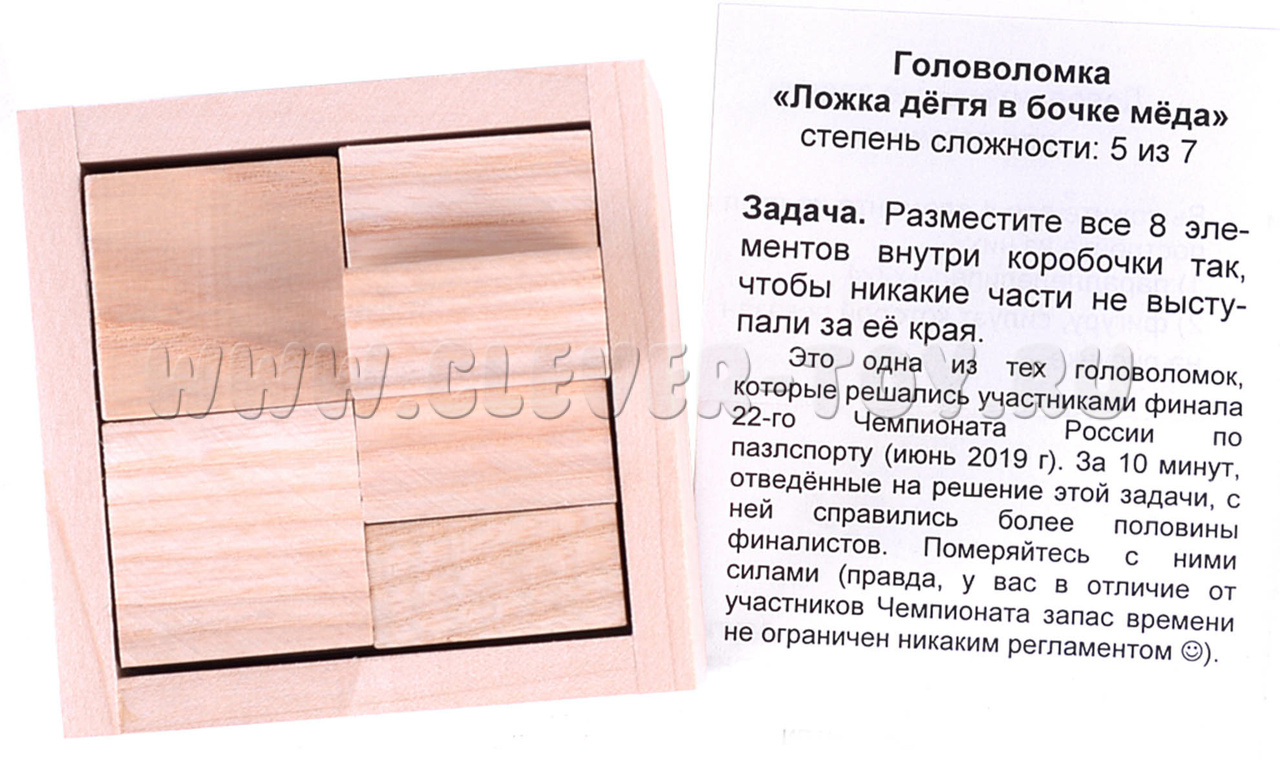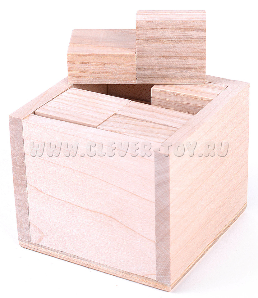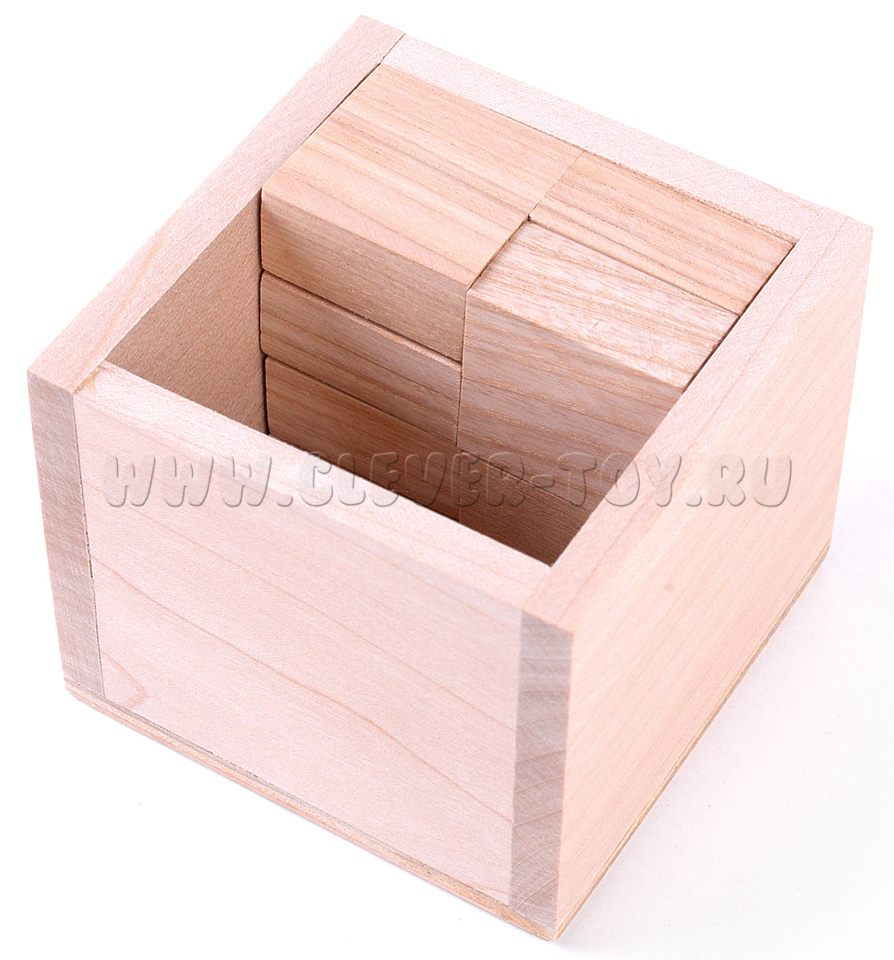 Ваша задача – уложить 8 элементов внутрь коробочки, чтобы ни один из них не выступал за края. Вспомните про название. Все не так просто, ведь пока вы не найдете решение, у вас всегда будет оставаться лишняя деталь или торчащий кусочек бруска.
