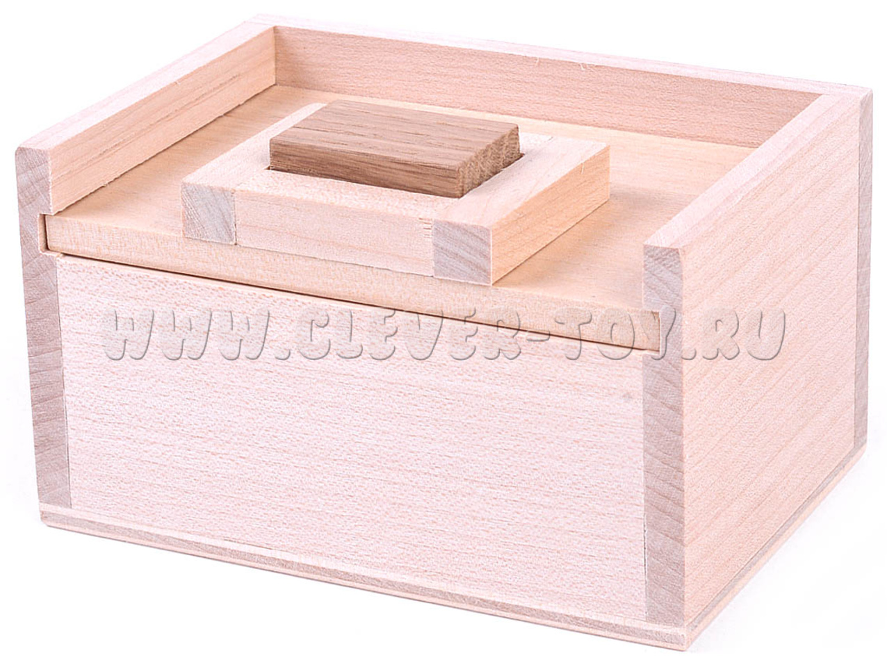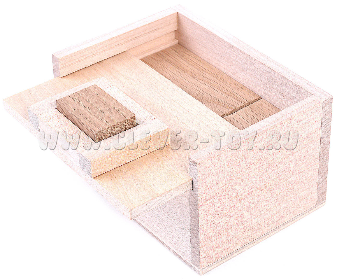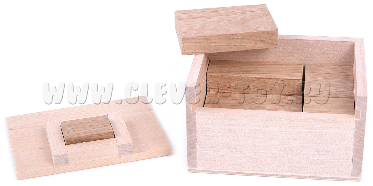 8 прямоугольных параллелепипедов укладываются в ящик и задвигаются крышкой. Казалось бы, внутри ящика совершенно нет места для девятого бруска (который пока расположен в специальной нише на верхней части крышки).
