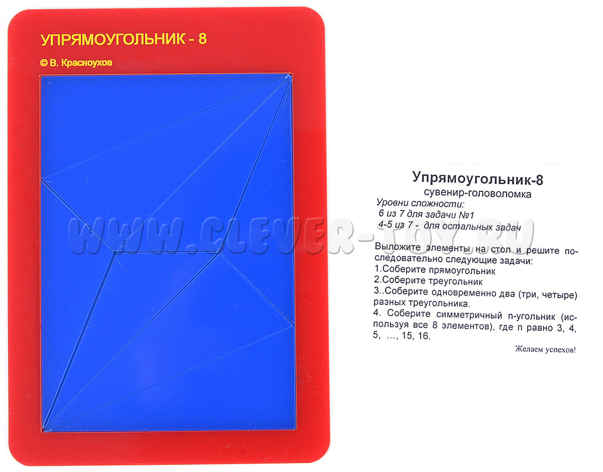 «Упрямоугольник-8» состоит из 8 плоских пластиковых треугольных элементов. Используя все 8 элементов, попробуйте решить следующие задачи: