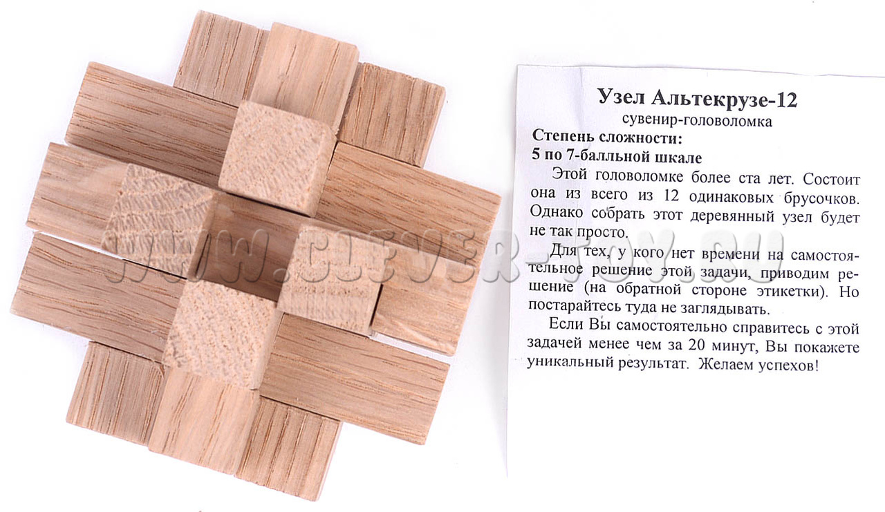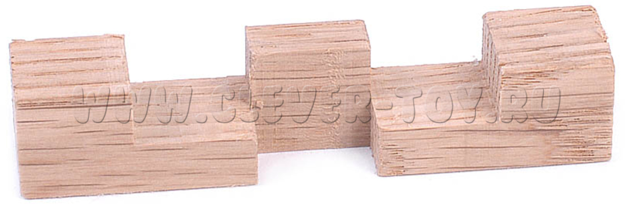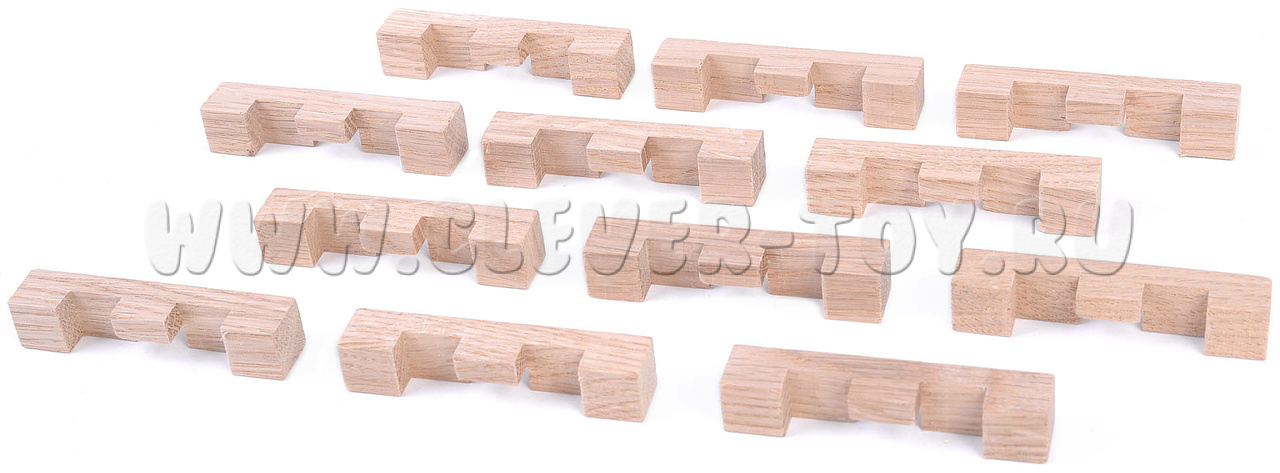 Головоломка состоит из 12 одинаковых брусочков. Все элементы головоломки выполнены из светлого отшлифованного дерева.