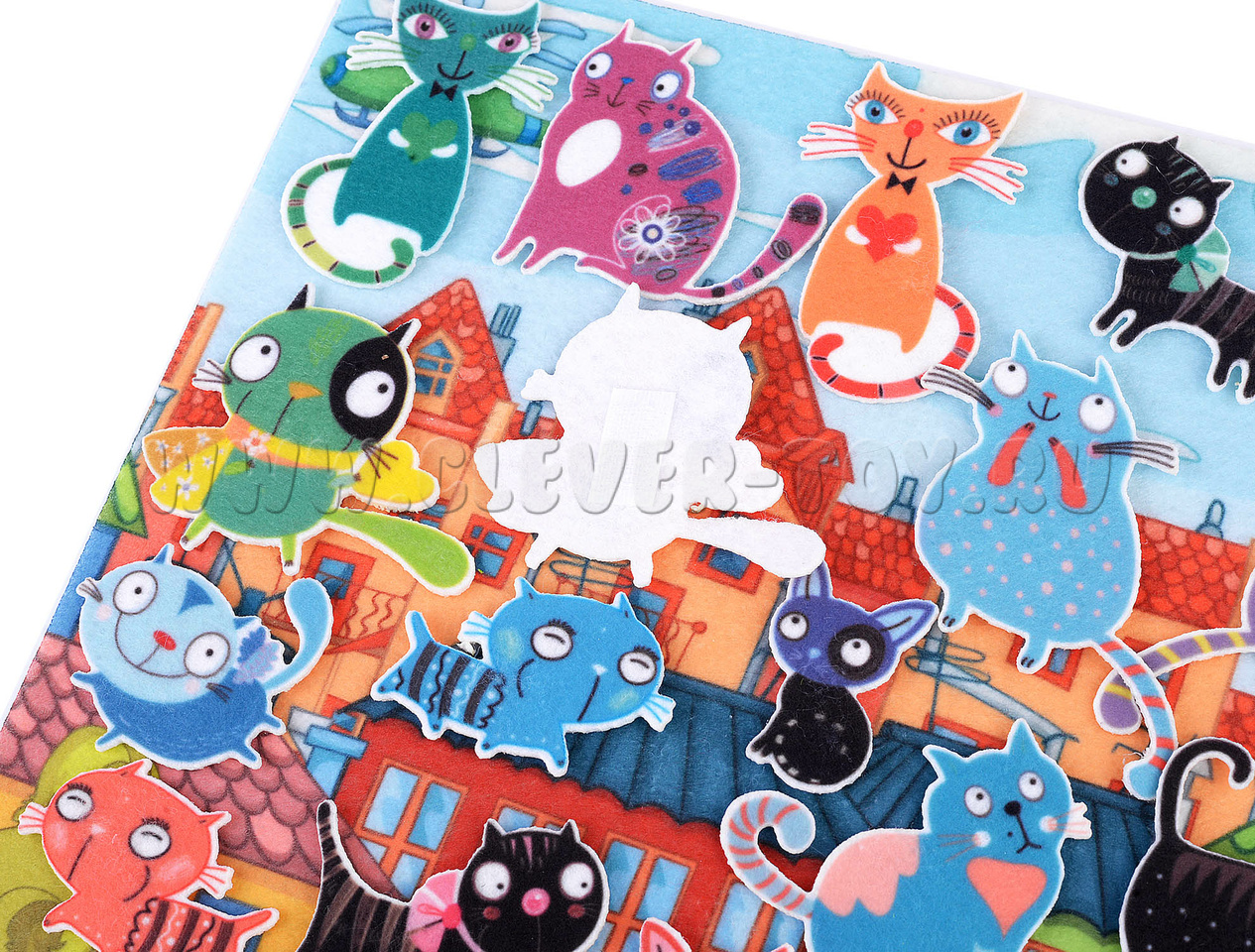 Маленькие дети (и, конечно, взрослые) обожают кошек. В наборе "Городские коты" все фигурки яркие, прочные, детально прорисованные. Каждая фигурка на липучке, поэтому котов можно поселить в квартире, у окошка, на крыше и даже на облачке.