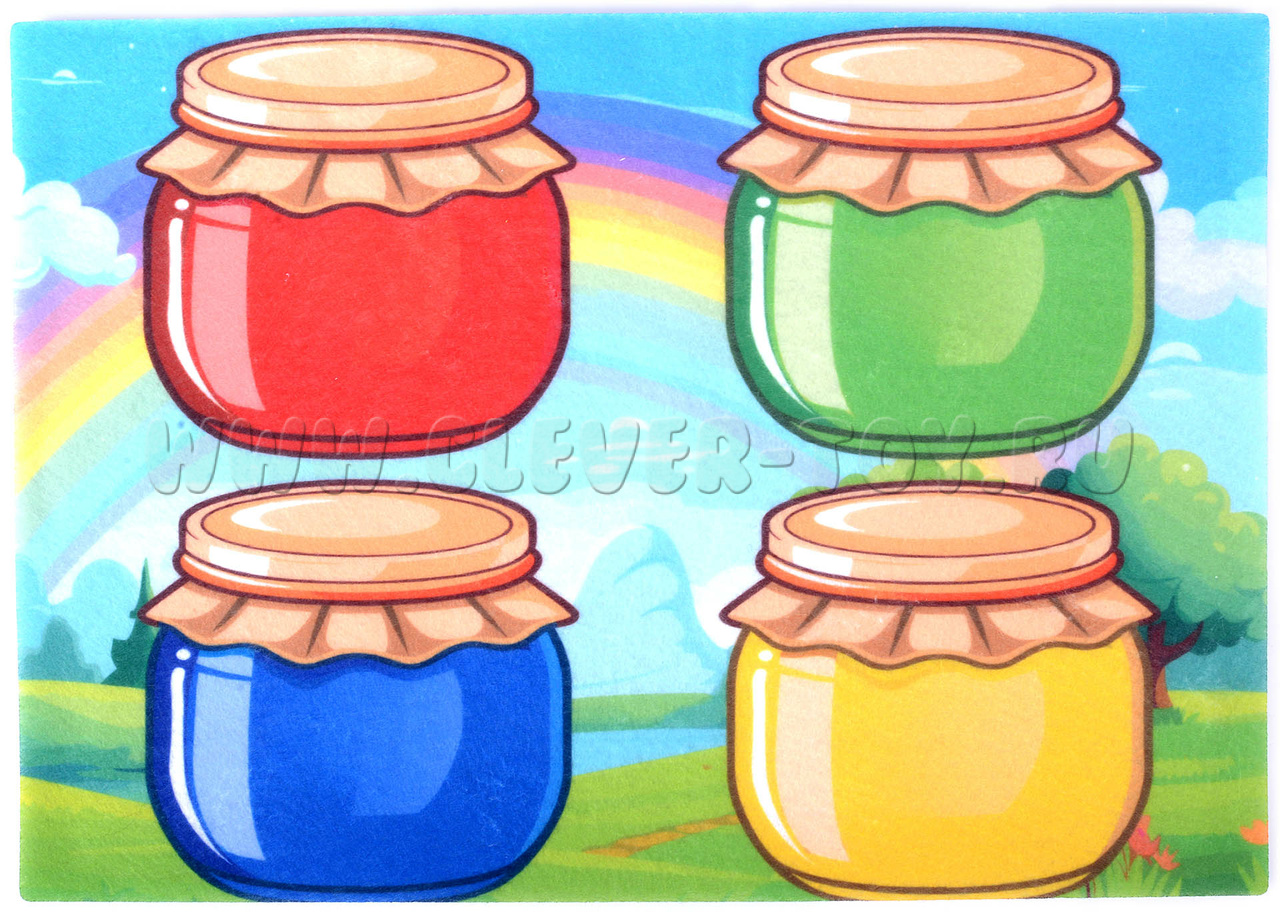 - Игровое поле с зеленым, красным, желтым и синим ведерками;