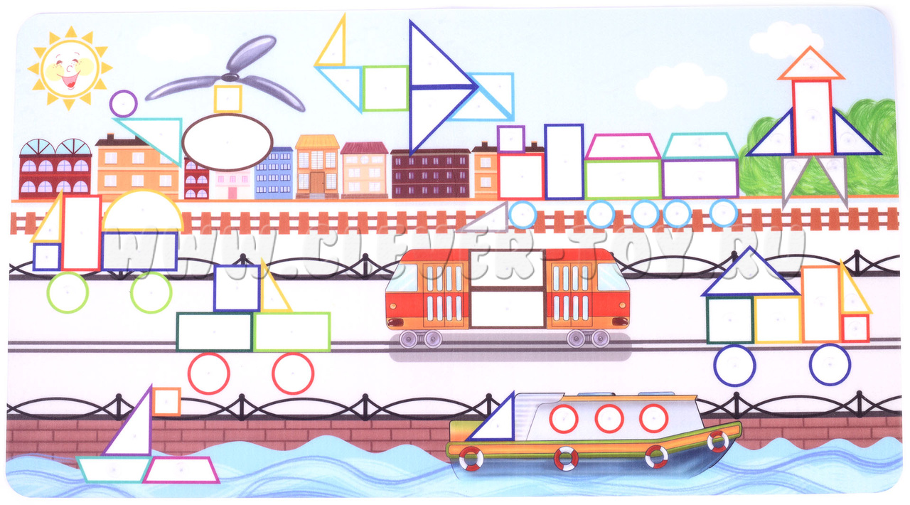1. Рассмотрите большой город  вместе с ребенком. Предложите "раскрасить" городской транспорт, подбирая соответствующие фигурки по цвету и форме. Назовите, какого цвета, какой формы колеса у грузовика, иллюминаторы у парохода, хвост у самолета и т.д. Сортируйте  геометрические фигуры по цвету, форме, размеру.