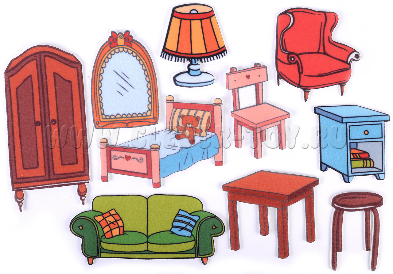 В комплекте вы найдёте 10 фигурок с изображением мебели, которые крепятся на липучках. Размеры фигурок: от 5,5 × 10 см до 9 × 18 см. Материал: фетр.