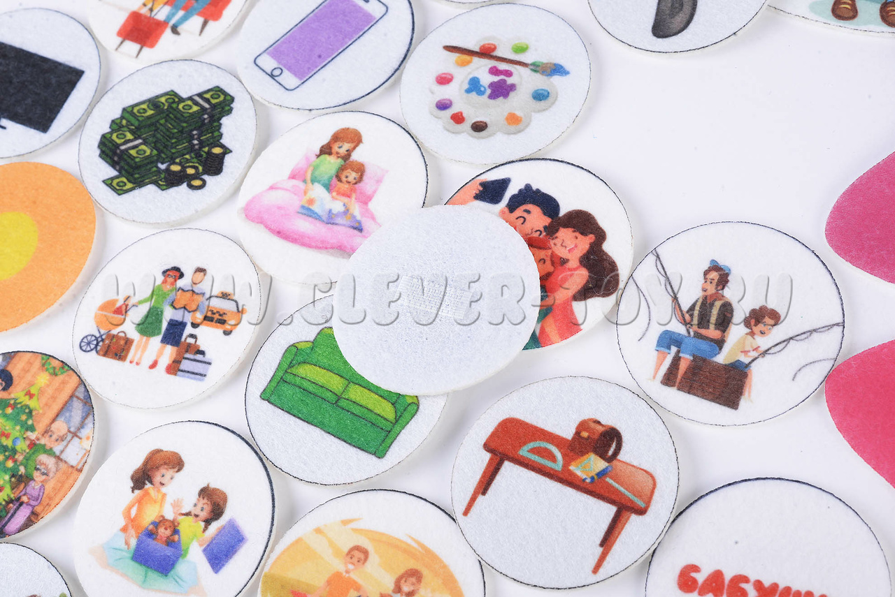 Игровое поле 25*35см, фигурки семьи, названий, портреты, фигурки занятий с детьми, лепестки.