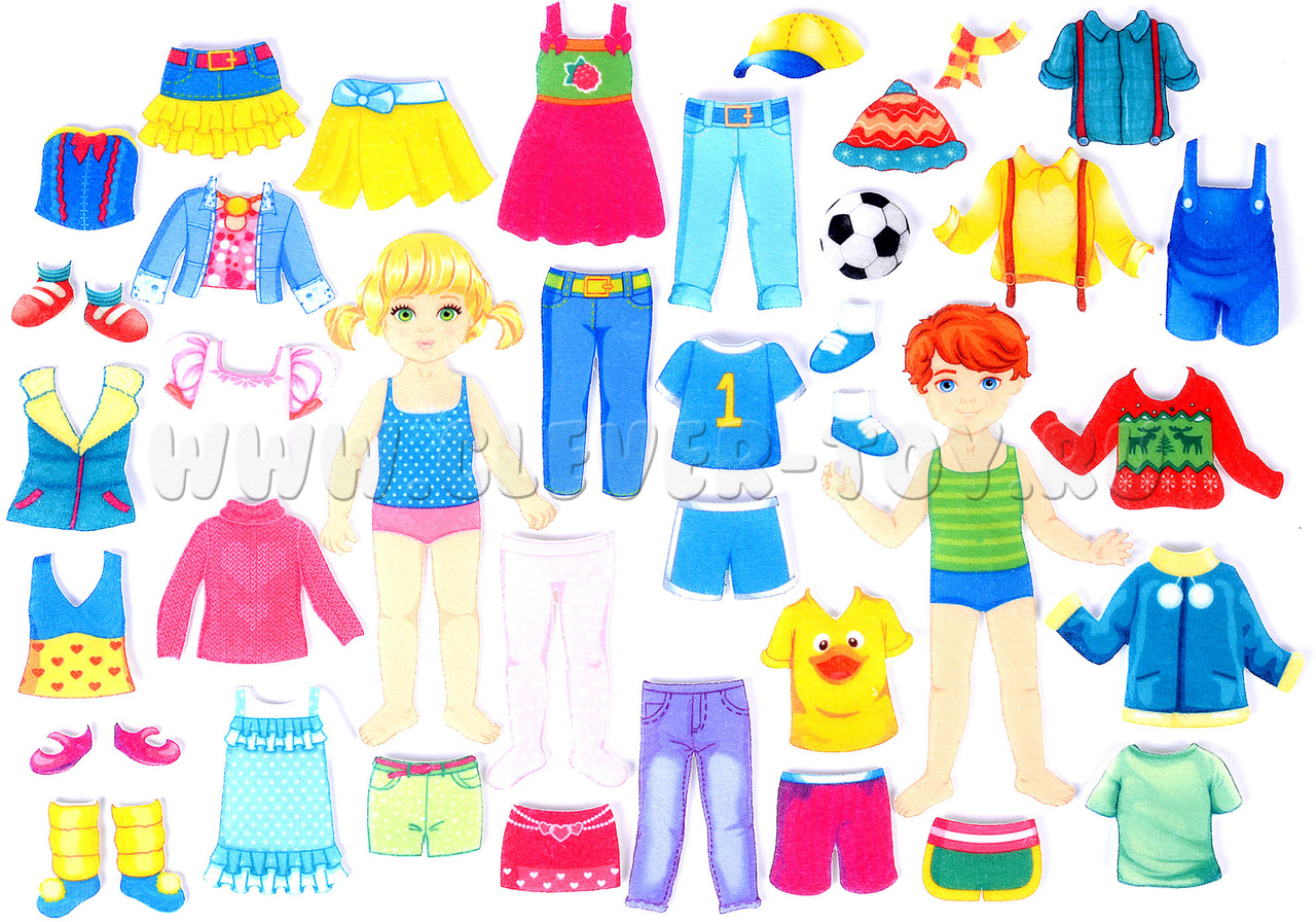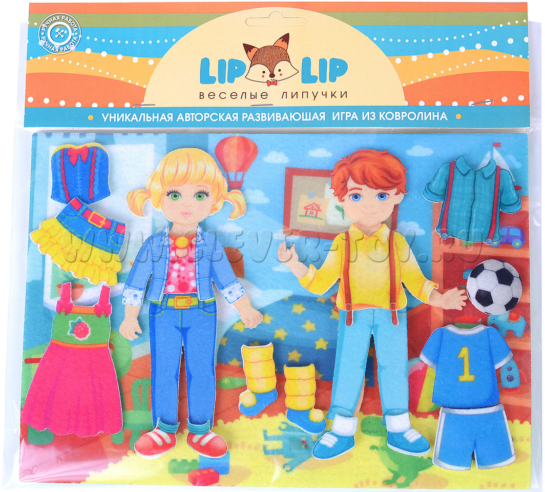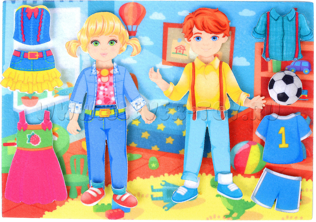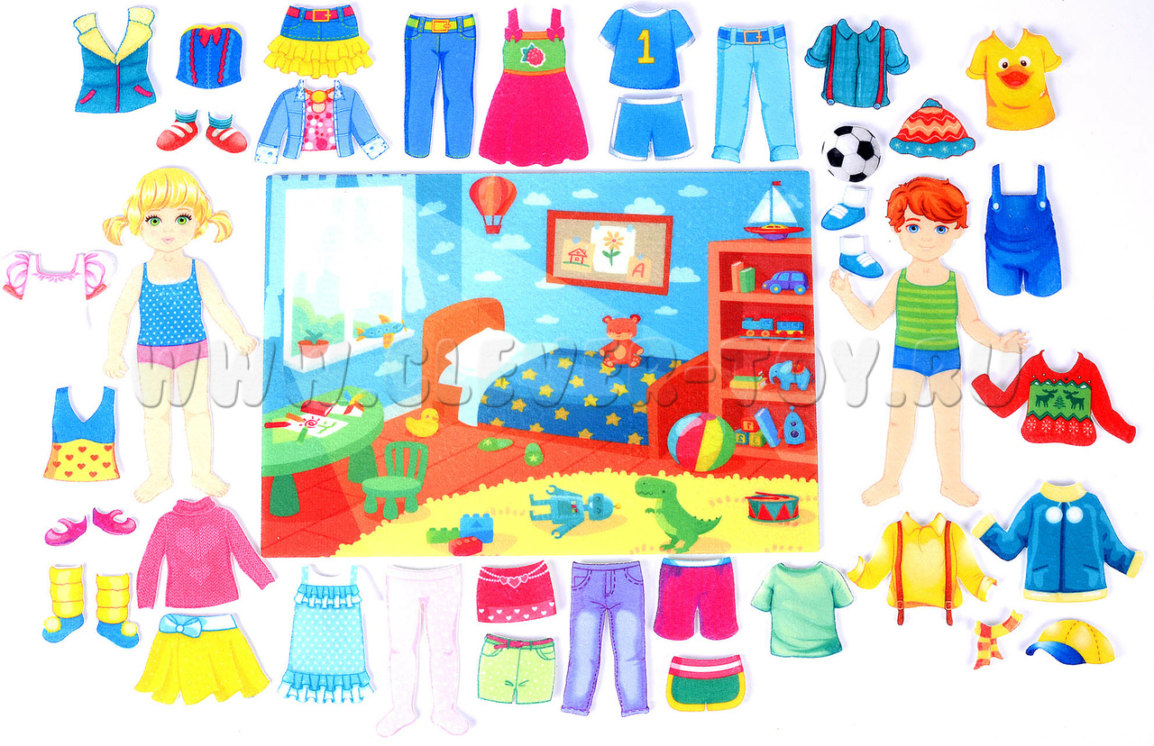 В набор входит: одежда для мальчика и для девочки на разные погодные условия, Фигурки мальчика и девочки и игровое поле в виде комнаты.