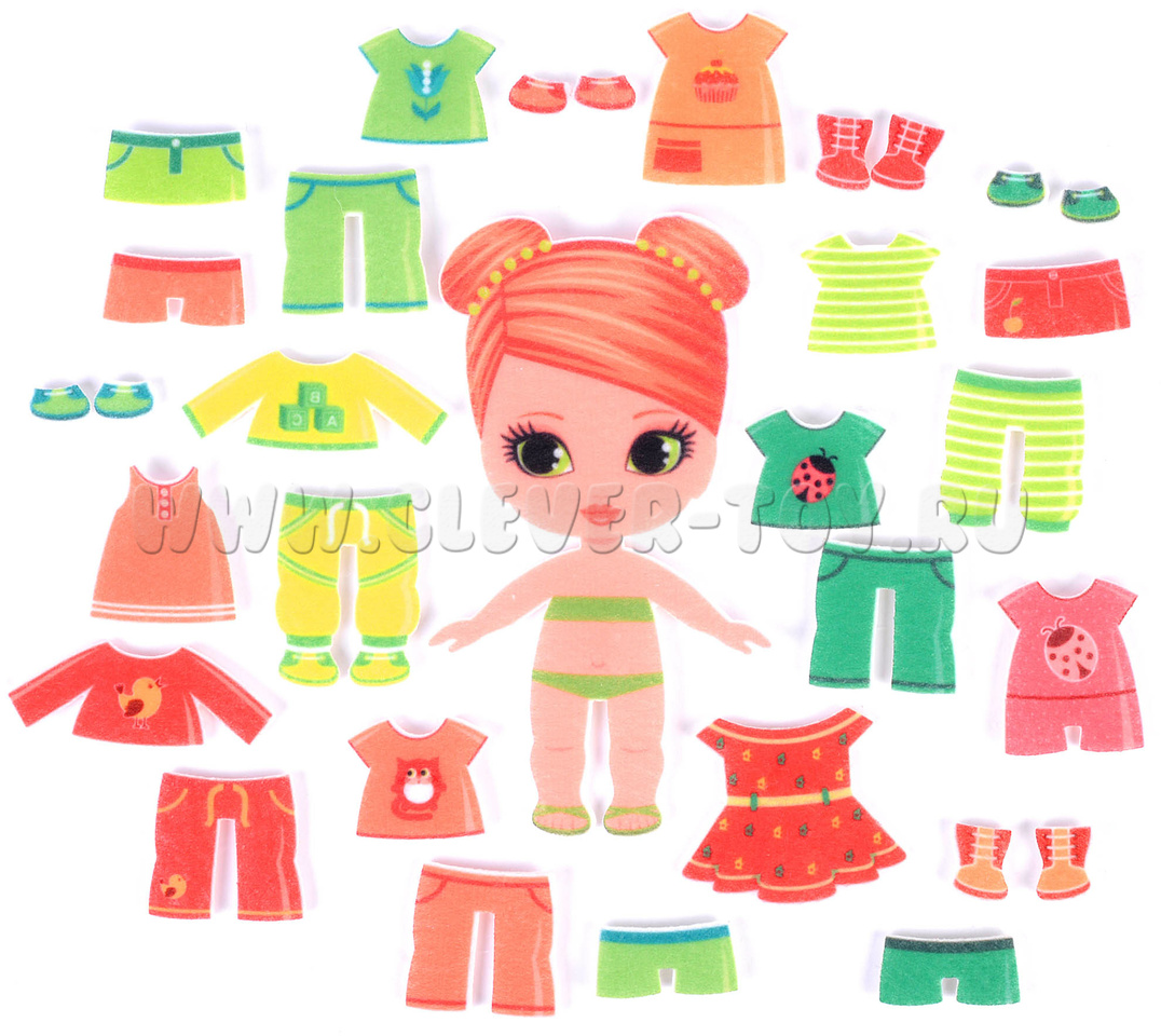 25 предметов одежды и обуви. Яркие, разноцветные, имеют многоразовые липучки и легко крепятся на фигурку девочки. Вся одежда прорисована до мельчайших деталей, включая украшения, картинки и шнурки на ботиночках.