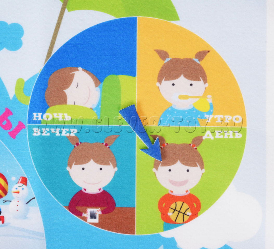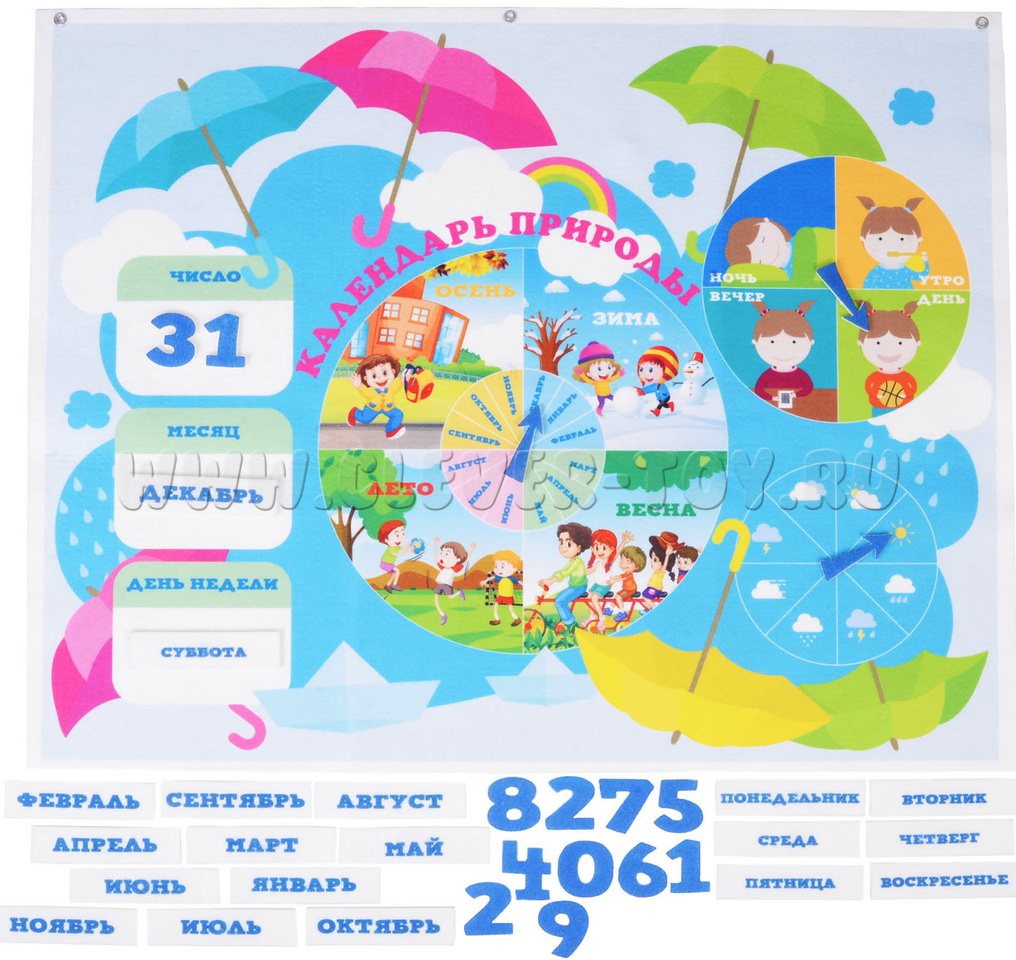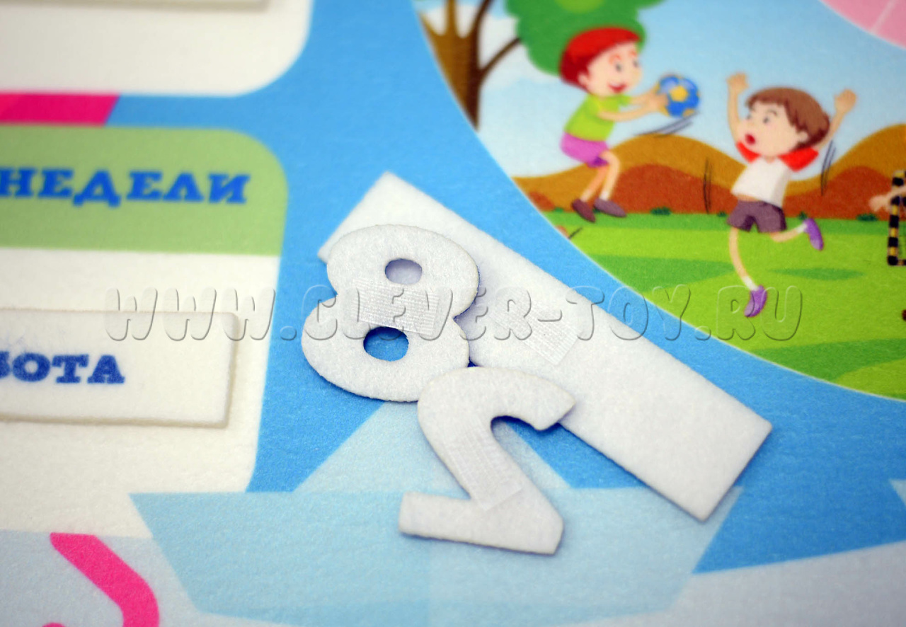 • игровые элементы из фетра на липучках – названия дней недели с понедельника по воскресенье, названия 12-ти месяцев, числа для обозначения даты, 3 стрелочки для весёлых и познавательных игр с Календарём.