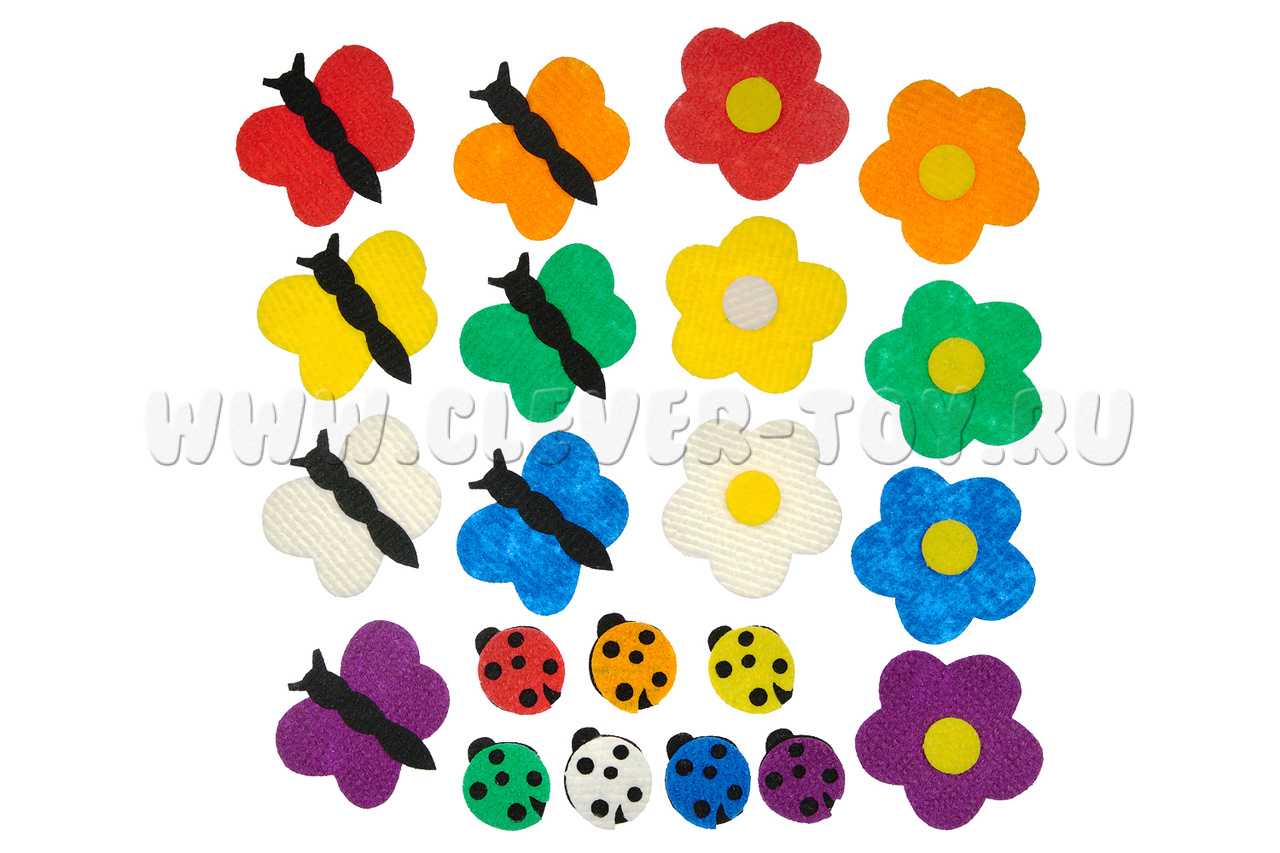 • 7 цветочков разных цветов – белый, красный, фиолетовый, оранжевый, синий, зелёный, жёлтый;