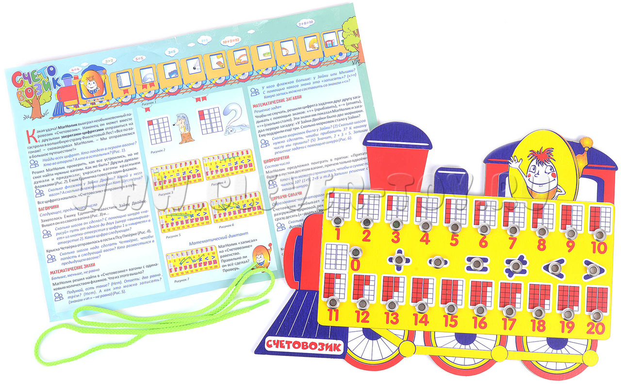 Перед вами уникальное игровое пособие, обладающее волшебными свойствами. Яркий деревянный счетовозик с шнурком и кнопками способен решать примеры, сравнивать числа, а главное – легко и весело изучать математику!