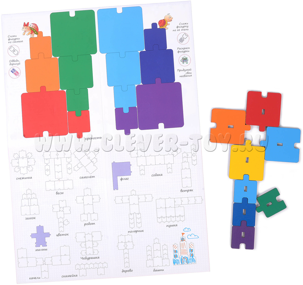 - альбом фигурок – 17 схем для плоскостного конструирования образных фигур (скамейка, юла, замок, ветряк, пушка, карусель, робот, цветок, чебурашка, ласточка, снежинка, качели, флажок, дерево, крепость, малыш, собака).