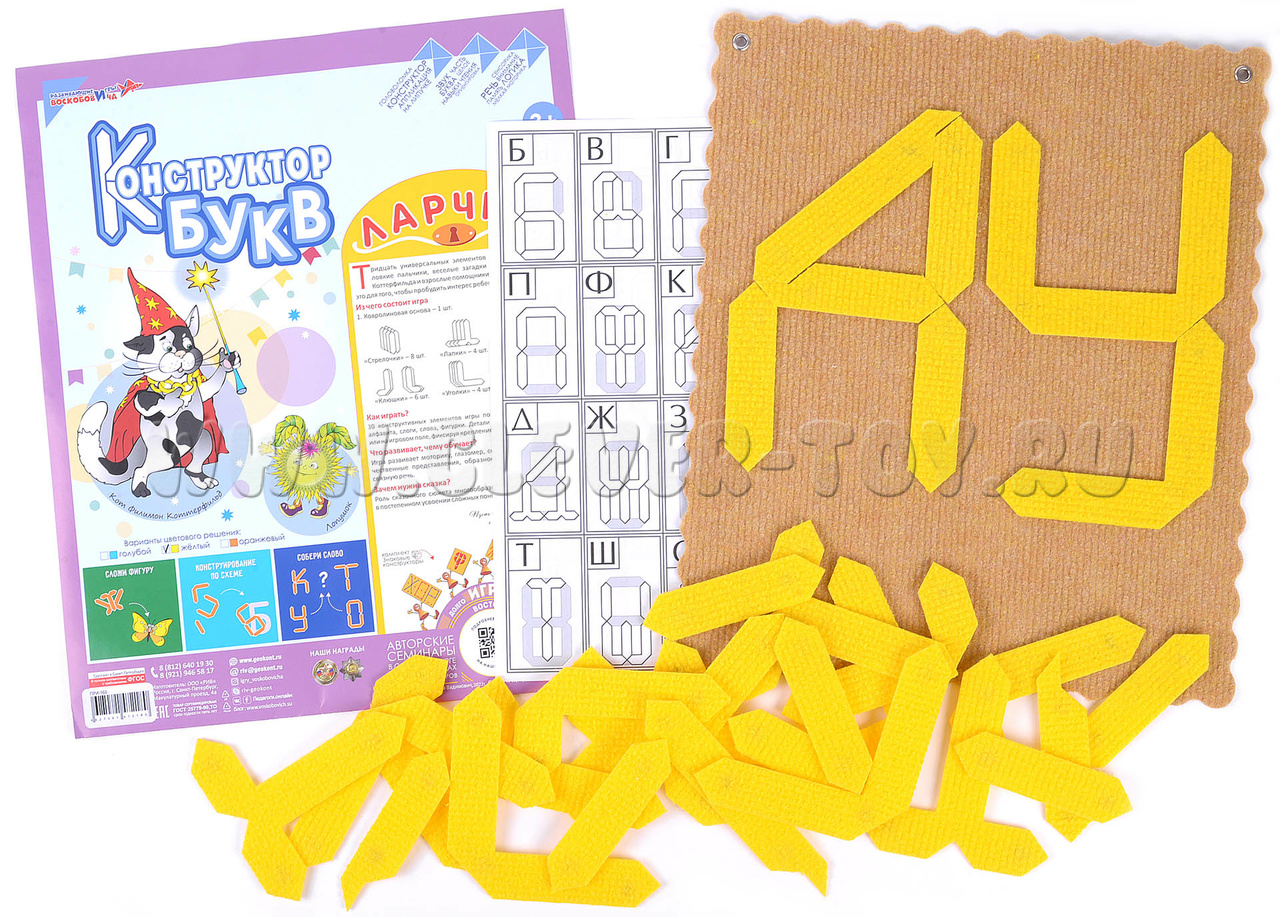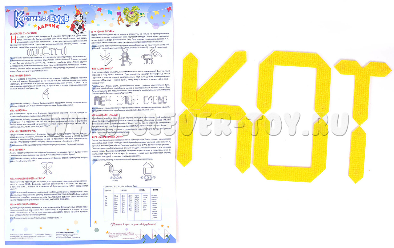 - увеличенная комплектация, позволяющая сконструировать не только одну букву, но и слоги, слова, состоящие из 2-6 букв,