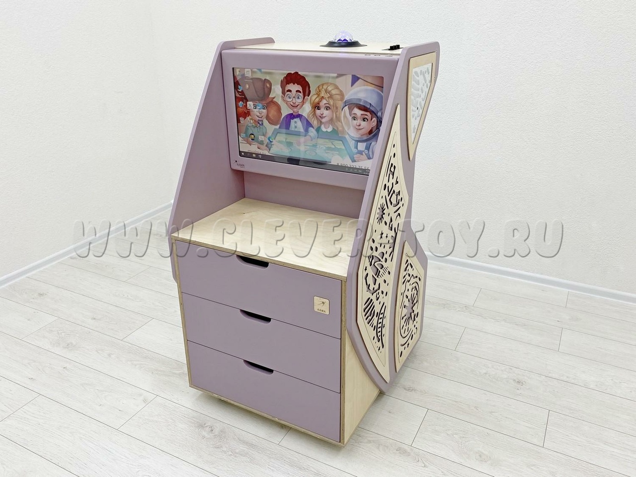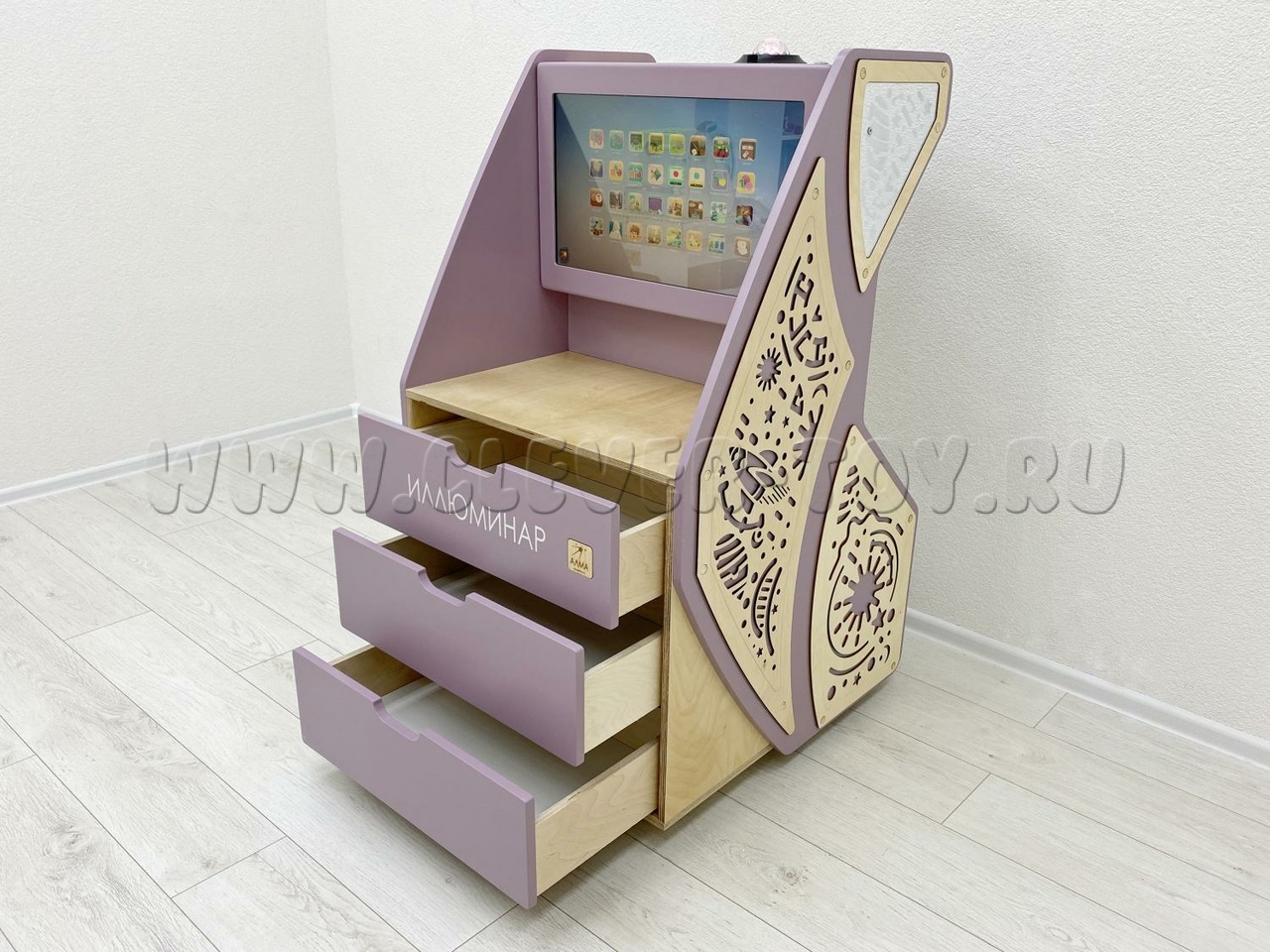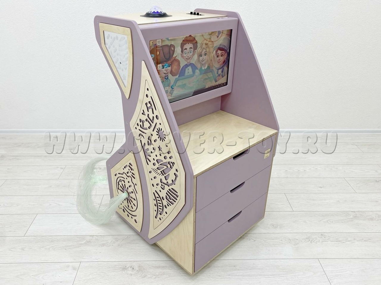 Универсальное оборудование для оснащения сенсорных комнат и кабинетов детских психологов. Мобильный комплекс включает: мультимедийную сенсорную панель с профессиональным ПО «Профиль психолога АЛМА», световую колонну, фонтан из фибероптического волокна, сенсорные панели, нейротренажёры, проектор звёздного неба и встроенную музыкальную систему.