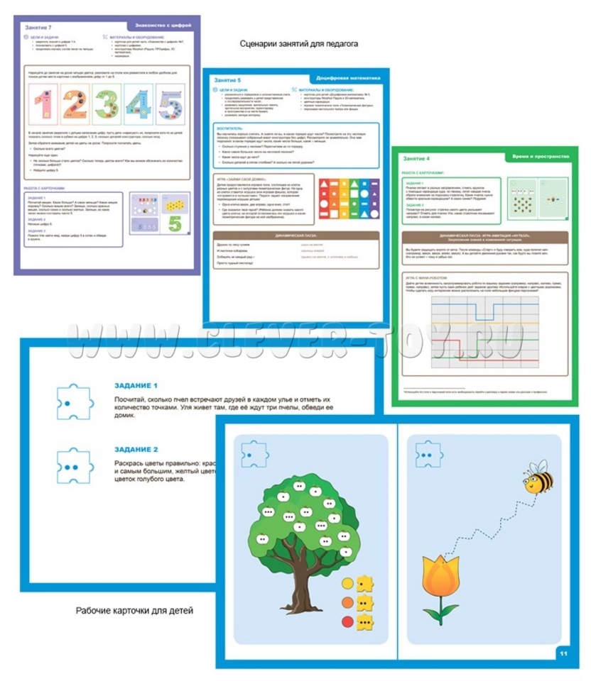 • Дополнительное игровое оборудование: фишки и игровые кубики, штампы с цифрами, настольный театр и др. Все составляющие комплекса, включая раздаточные карточки для детей, дополняют друг друга и делают работу воспитателя методически осмысленной и планомерной, не сдерживая его инициативу и творчество.
