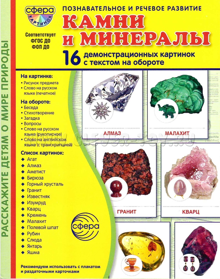 Комплект картинок "Камни и минералы" состоит из 16 цветных демонстрационных карточек (картинок) и адресован детям и их родителям, желающим познакомиться с самыми известными драгоценными и полудрагоценными камнями нашей планеты, узнать их предназначение, свойства и роль в жизнедеятельности человека.