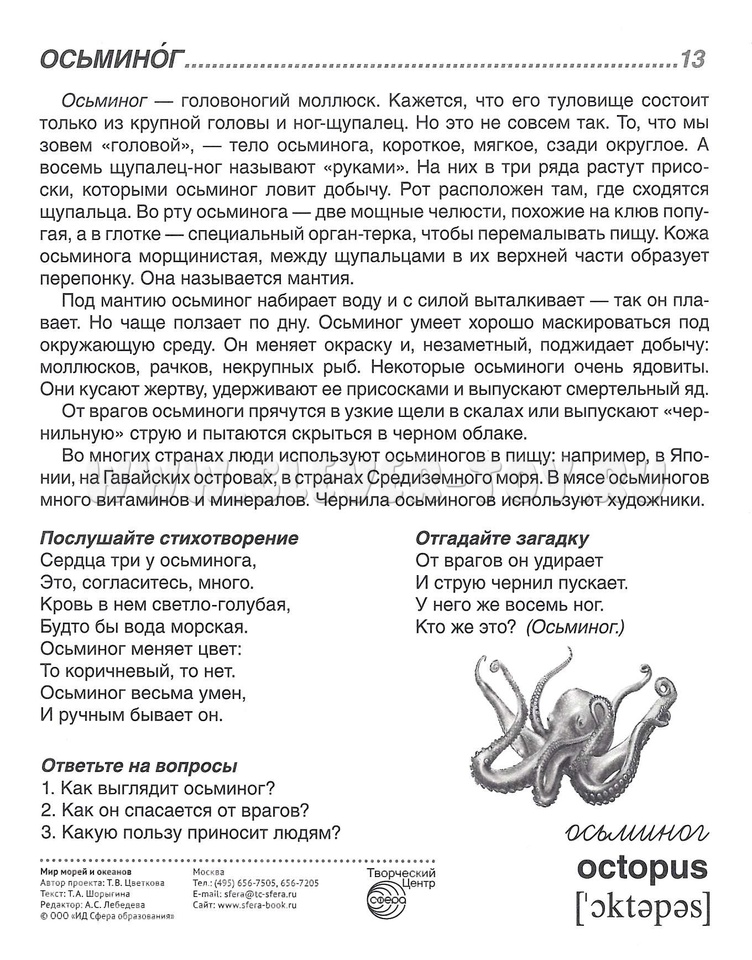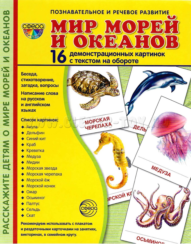 Состав комплекта (16 карточек): Рыбы: акула, дельфин, морской конек, синий кит, палтус, сельдь, скат. Моллюски: мидии, осьминог. Ракообразные: краб, креветка, омар. Беспозвоночные: медуза, морская звезда, морской ёж. Рептилии: морская черепаха.