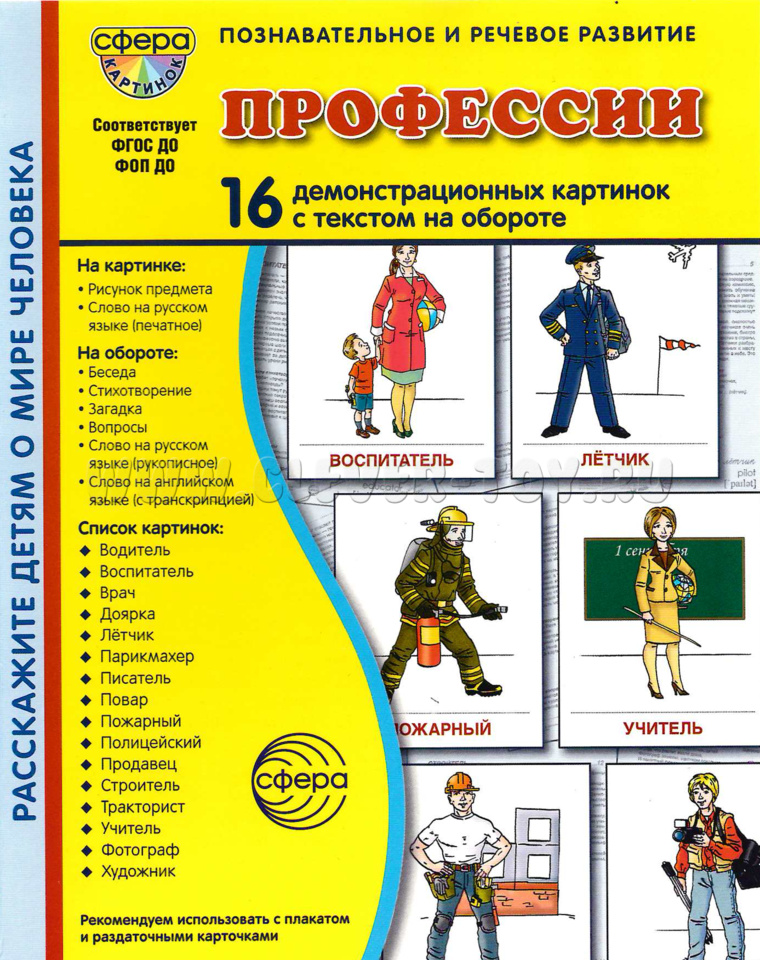 Набор карточек "Профессии" состоит из бесед, стихотворений, загадок и вопросов по теме. Комплект включает 16 цветных демонстрационных картинок с текстом на обороте, названия тем имеют перевод на английский язык.