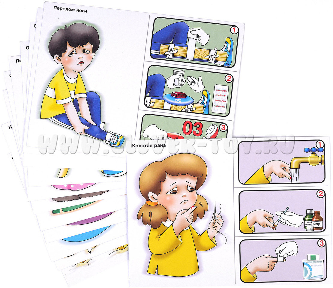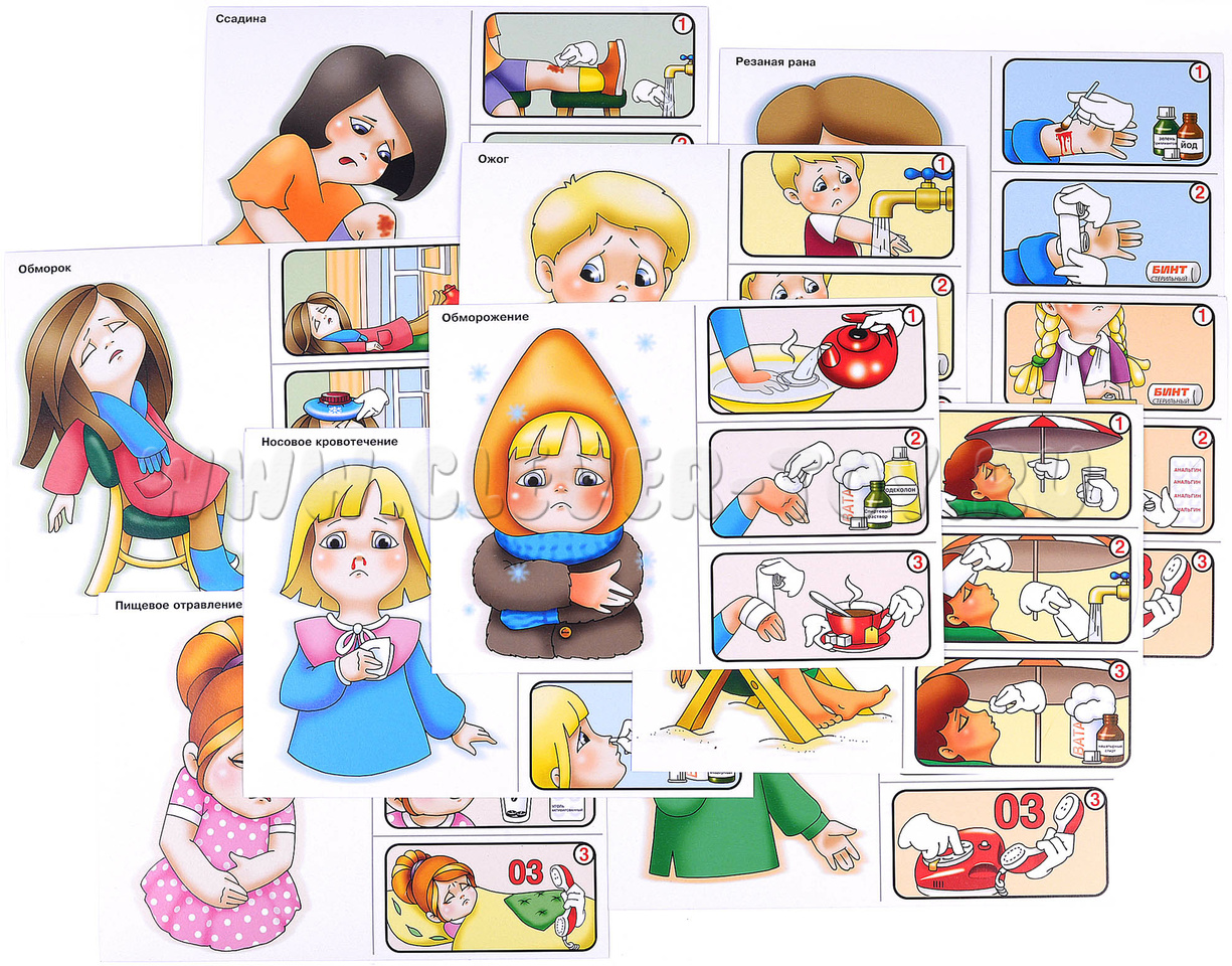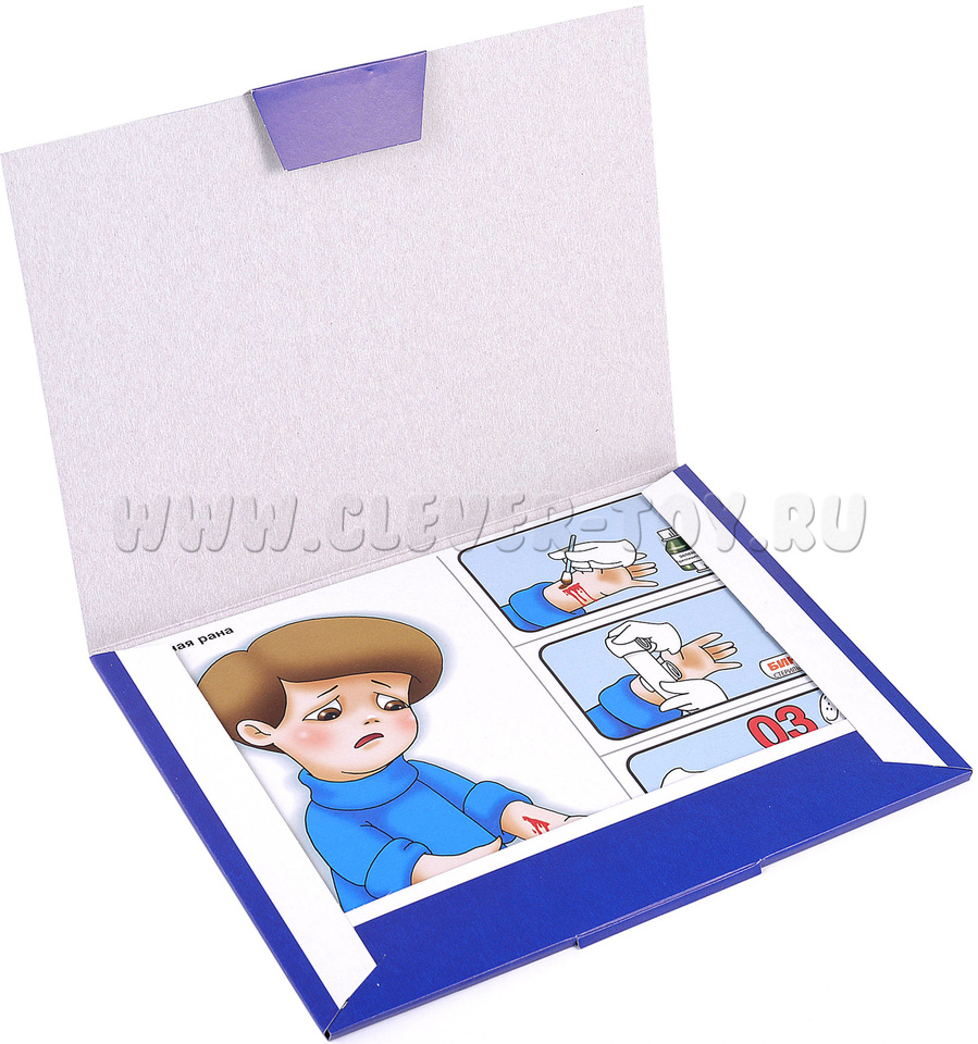 В составе набора 12 листов формата А4, иллюстрирующих наиболее часто встречающиеся травмы и способы оказания первой помощи. Использовать материалы можно как цельными картами, сопровождая беседу их демонстрацией, так и разрезать по линиям (отделив травму от способа оказания помощи) и предложить детям соотнести ситуацию и необходимые действия самостоятельно.