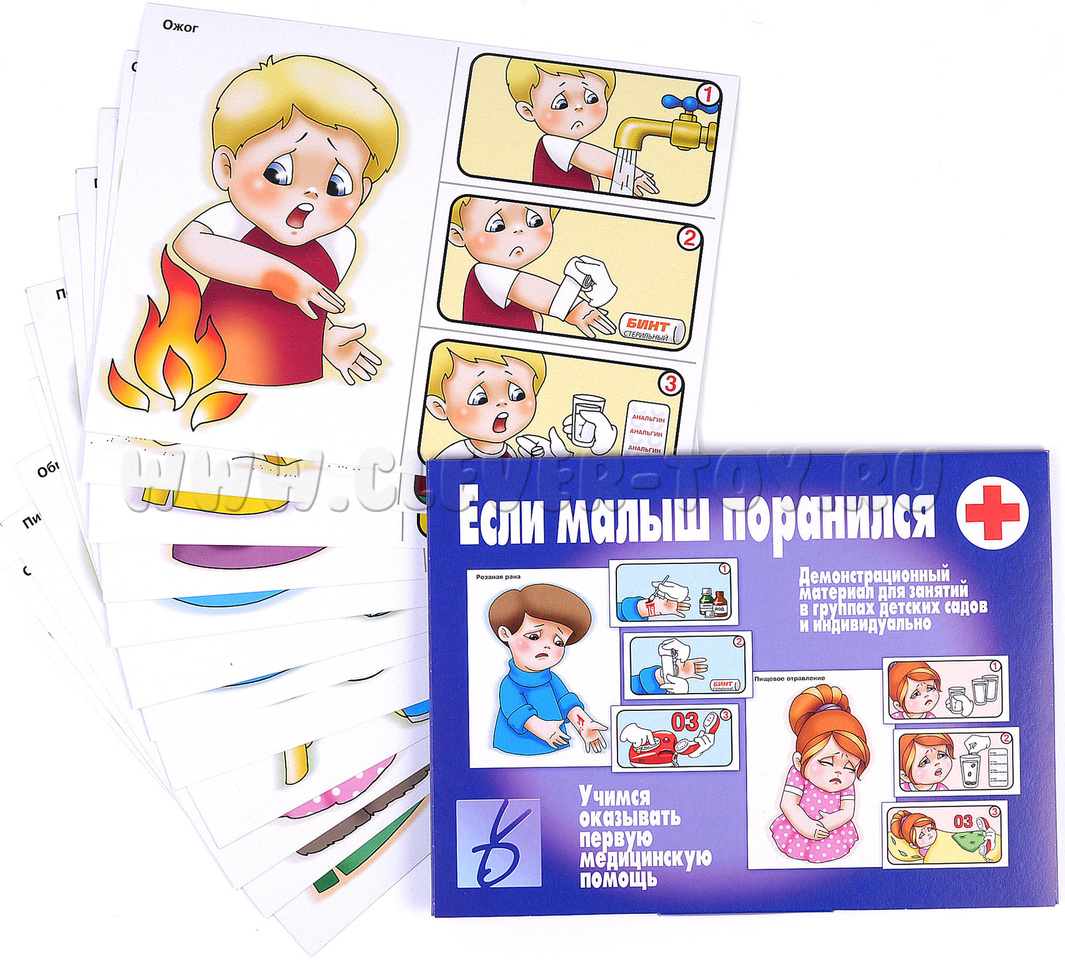 Демонстрационный материал "Если малыш поранился" адресован родителям, педагогам ДОО и воспитателям дошкольных учреждений и подойдет для организации занятий по основам техники безопасности и первой медицинской помощи среди детей старше 3-х лет. Занятия с демонстрационными материалами помогут малышам в: