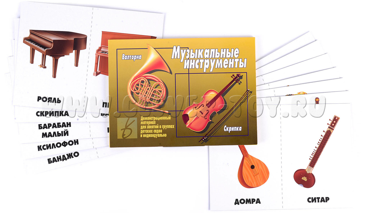 Демонстрационный материал знакомит детей с различными музыкальными инструментами. Он предназначен для занятий с детьми в группах детского сада и индивидуально.