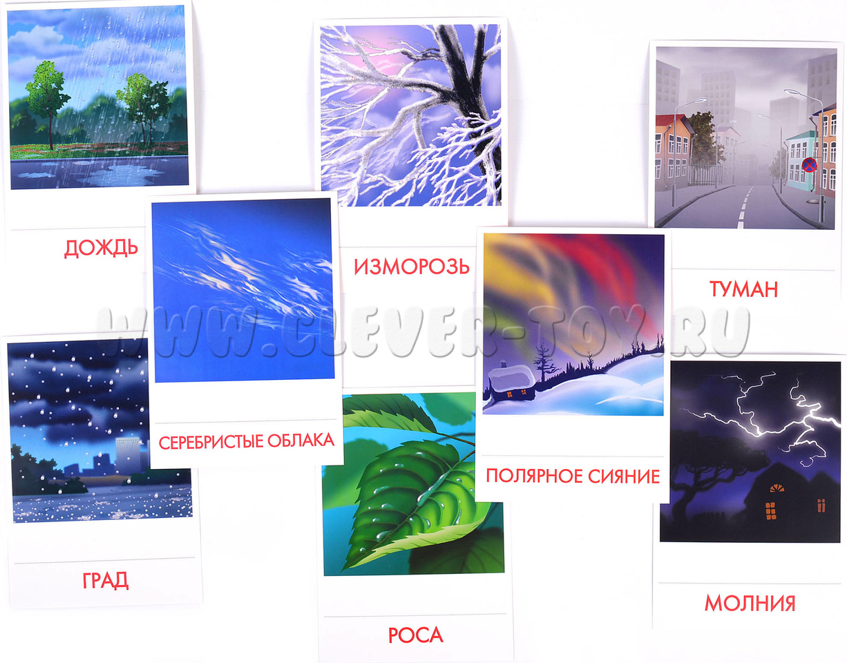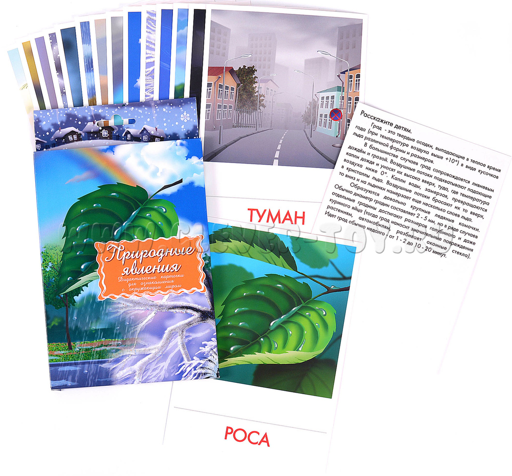 В набор водит 16 карточек с изображениями природных явлений: