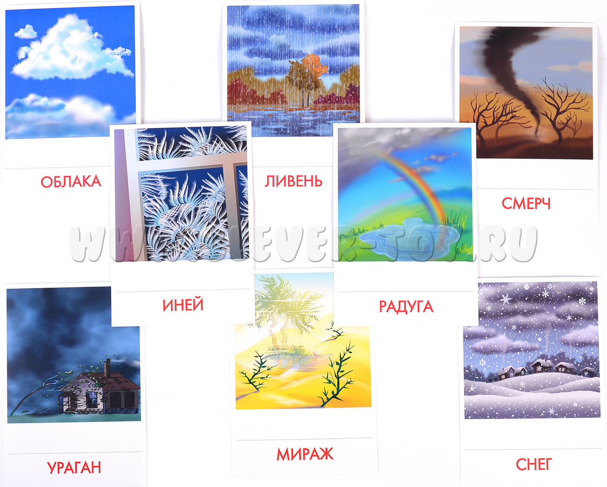 • Подробно опишите любое природное явление, нарисованное на картинке, не называя его. Предложите ребёнку догадаться, о чем идет речь и подобрать соответствующую карточку. Затем поменяйтесь с ребёнком местами: он описывает, вы отгадываете.