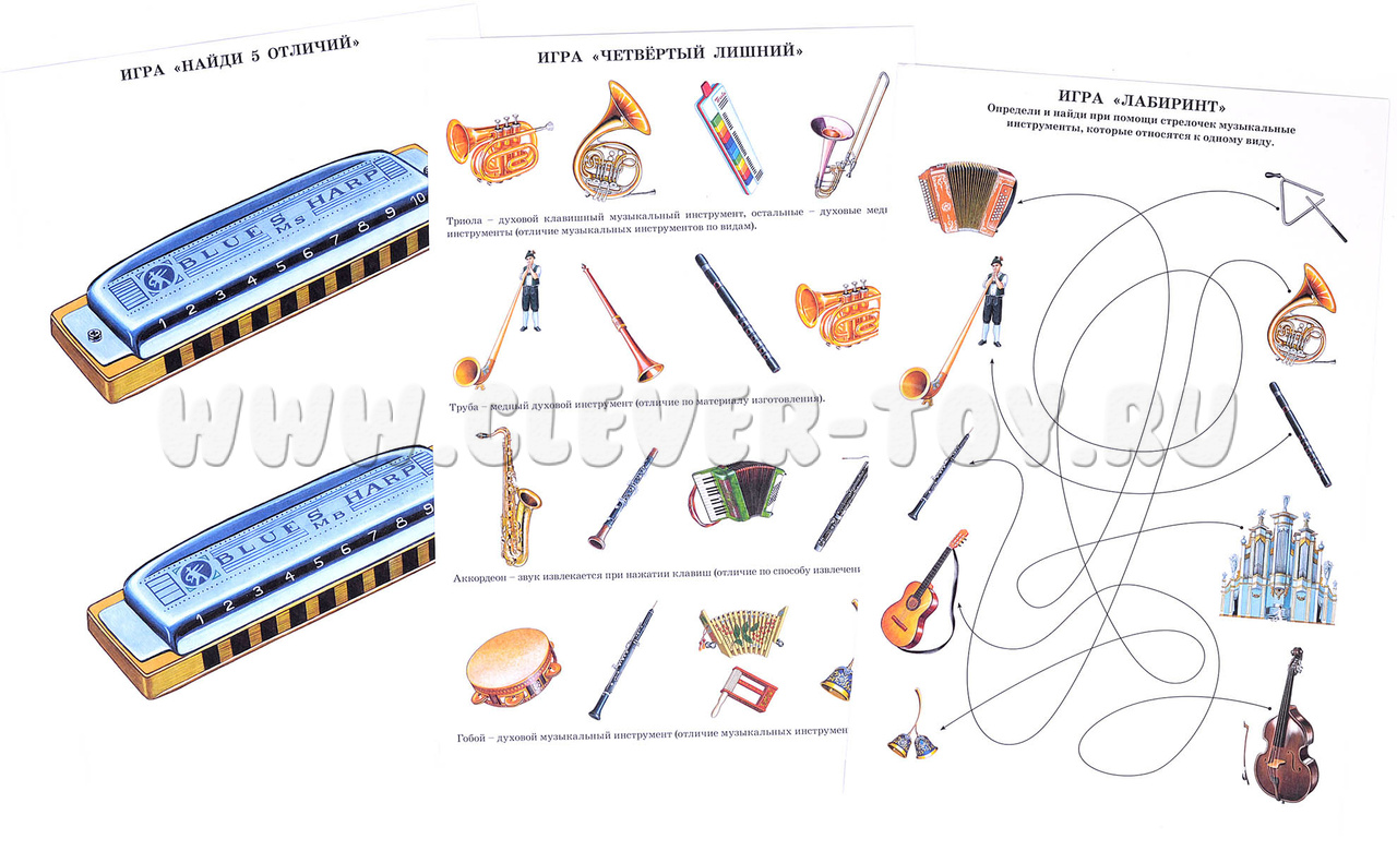 • Игры "Лабиринт" (нужно найти при помощи стрелок музыкальные инструменты, которые относятся к одному виду); Игры "Найди 5 отличий";