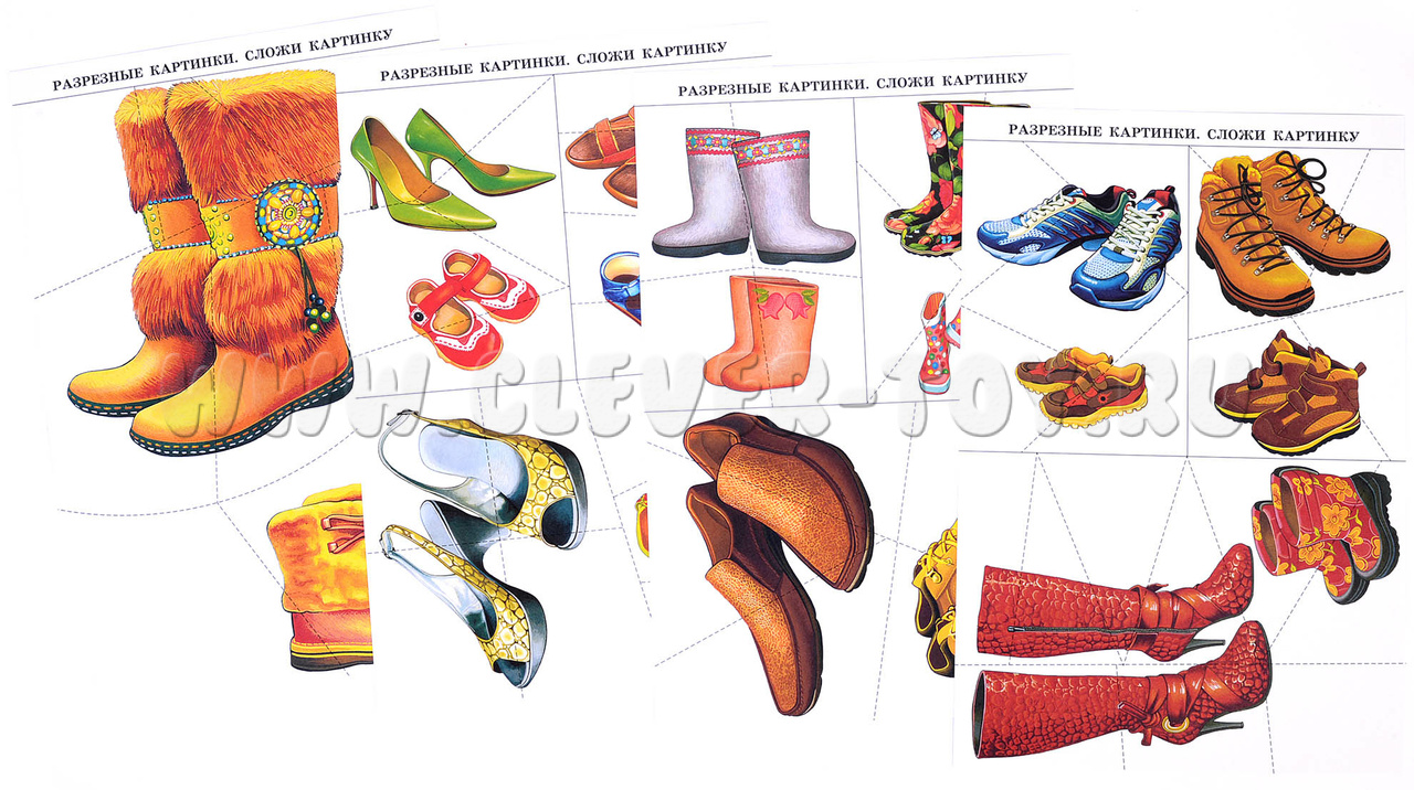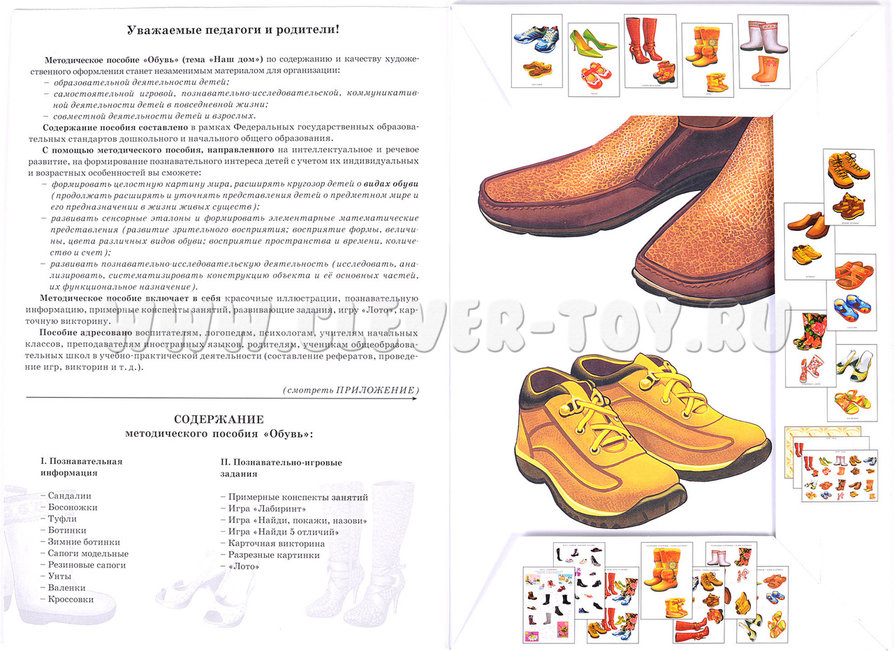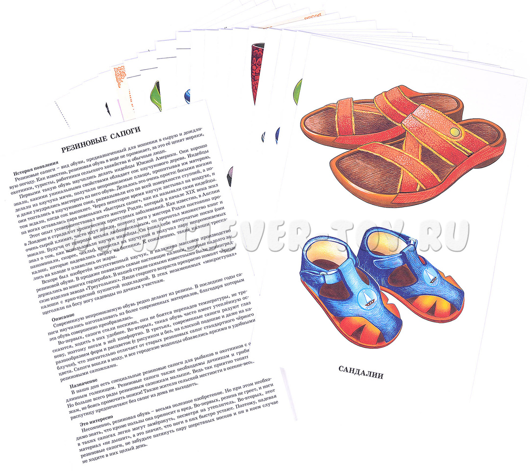 • 10 изображений различных видов обуви, на обороте - краткая историческая справка, интересные факты, описание, назначение;