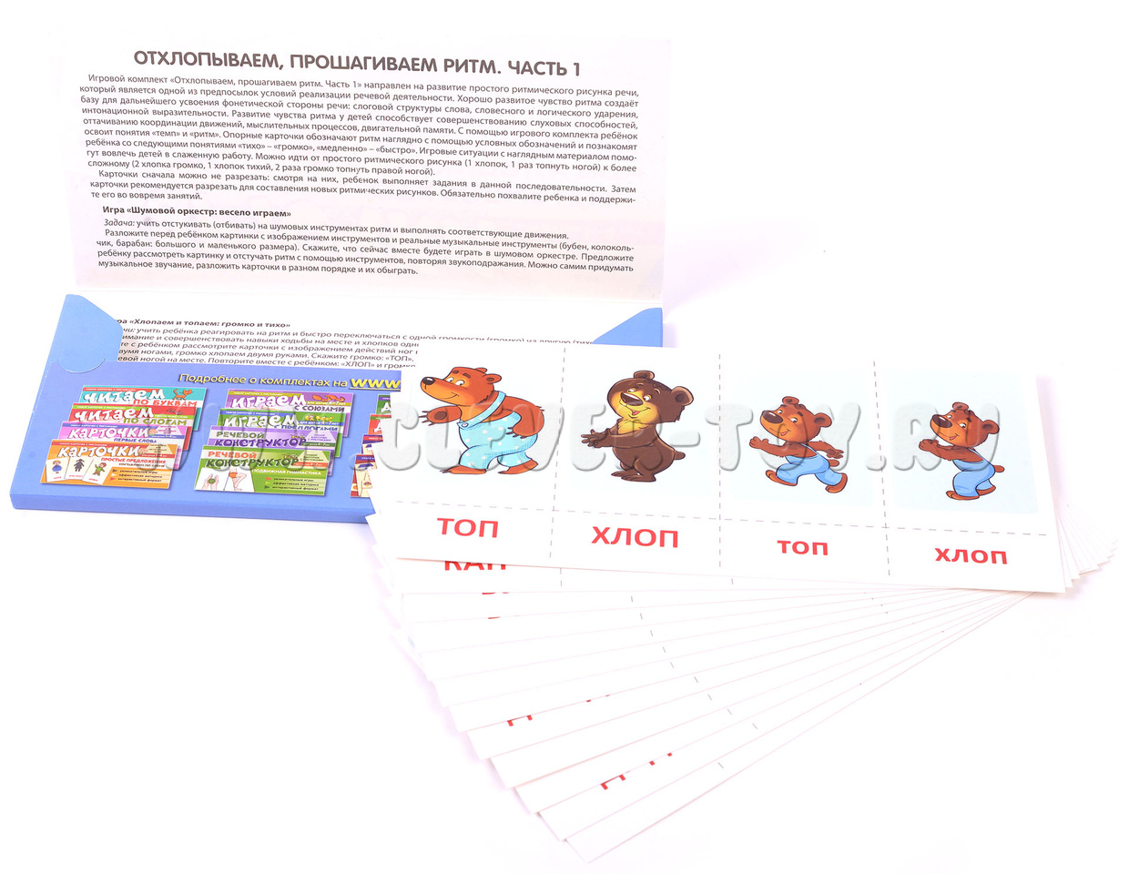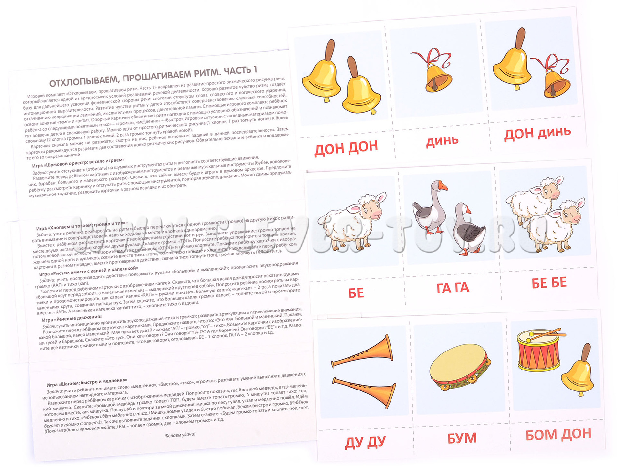 Комплект "Отхлопываем, прошагиваем ритм. Часть 1" - это 12 листов, в которые входят 78 карточек и 5 увлекательных игр. Он разработан для детей от 1 года до 4 лет, чтобы помочь им развивать простой ритмический рисунок речи.