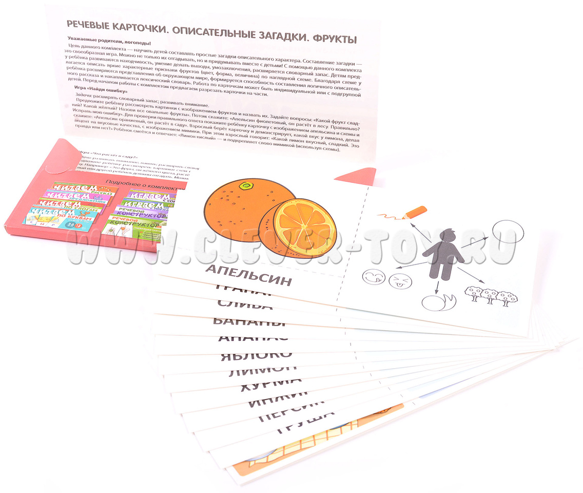 Комплект "Речевые карточки. Описательные загадки. Фрукты" представляет собой 12 листов, состоящих из 35 карточек и 4 игр.
