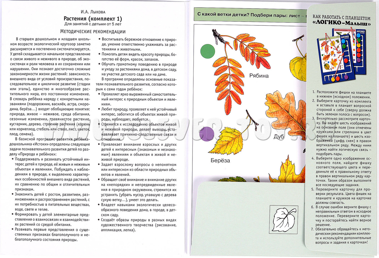 В процессе решения заданий ребёнок будет не только узнавать и называть новые и уже хорошо ему известные виды растений, но и называть их отдельные части, подбирать пары лист-плод и вершки-корешки, верно выстраивать этапы развития растений, искать различия и общие признаки у разных видов. Задания по теме равномерно распределены на два комплекта карточек Растения (1) и Растения (2), и не повторяются. Примеры заданий в карточках: 1а. С какой ветки детки? Подбери пары: лист – плод. 2а. Путаница: вершки и корешки. Исправь ошибки. 3б. Покажи дерево, кустарник, травянистое растение. Чем они похожи и чем отличаются? 4а. С какого дерева листок? 4б. Назови деревья. Какие из них лиственные, а какие хвойные?