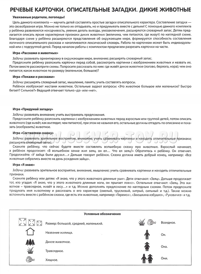 Комплект "Речевые карточки. Описательные загадки. Дикие животные" состоит из 12 листов с 35 карточками и 4 играми. С их помощью ребенок научится различать предметы по цвету, форме и величине, составлять описательные загадки, делать выводы и расширять свой словарный запас. Этот учебно-игровой набор способствует развитию речи, обогащению словарного запаса и умению составлять описательные рассказы. Желаем увлекательных и познавательных занятий!