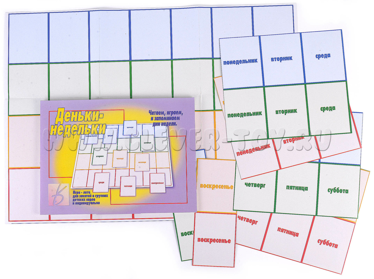 Развивающая игра-лото, которая поможет детям дошкольного возраста выучить дни недели, их последовательность. Перед началом игры требуется разрезать карты с названиями дней недели по пунктирным линиям на квадраты.