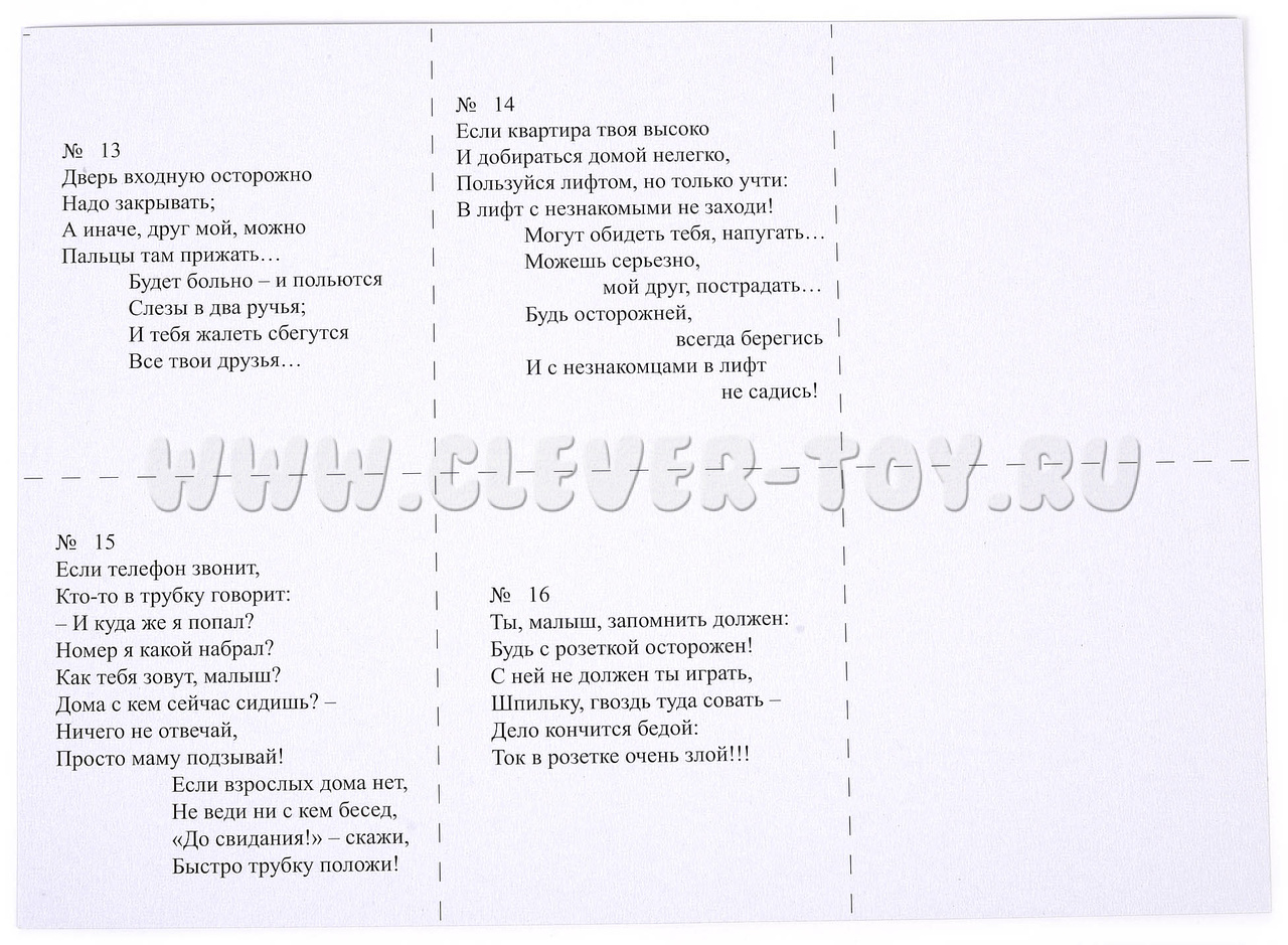 • Раздайте детям поровну картинки-иллюстрации. Начните зачитывать стихотворения. Игрок, чья картинка соответствует содержанию стихотворения, забирает карточку с ним себе и объясняет, как избежать опасной ситуации и выйти из нее, если ситуация все же случилась;