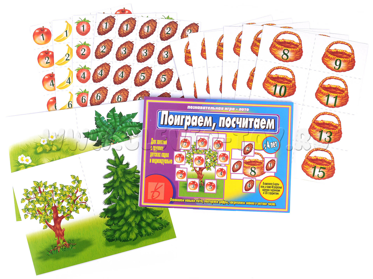 • 4 большие карты с яблоней, пальмой, ёлкой и поляной;