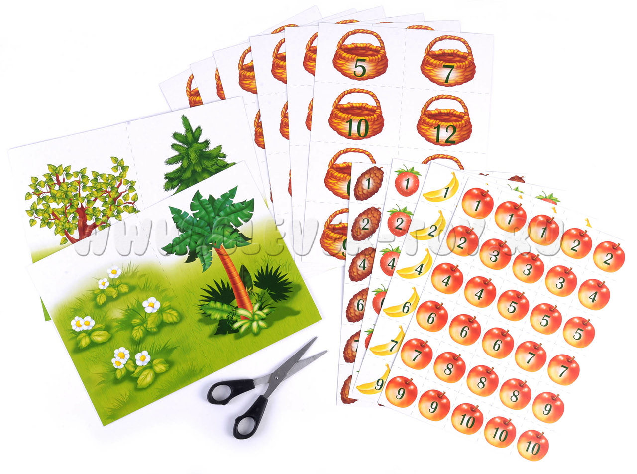 4. Предложите собрать и разложить на карточке с яблоней яблоки так, чтобы числа в сумме соответсвовали определенному числу, например 30, 40, 50, и т.д.