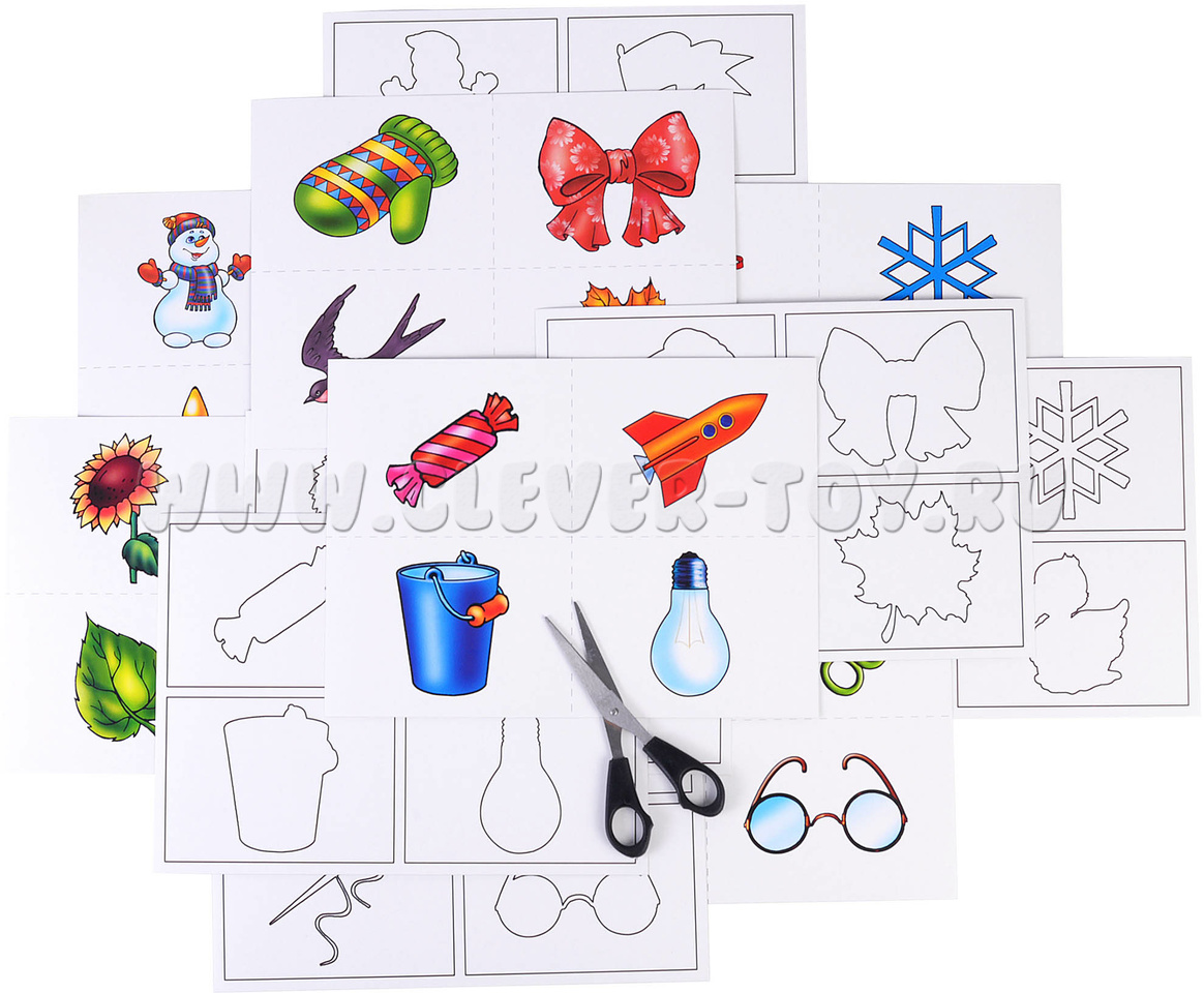 1. Ребенку или группе детей предлагаются большие карты с черными контурами предметов. В случае с группой карты делятся поровну. Ведущий показывает карточку с предметом, ребенок, нашедший подходящий по контуру предмет, забирает её себе;