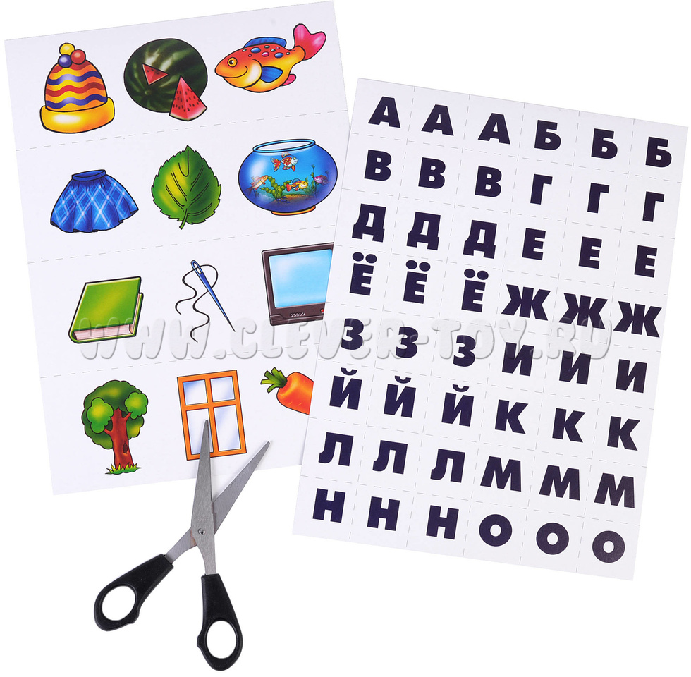 Количество: 2 разные карты с буквами русского алфавита (по 3 одинаковых буквы, всего 96 карточек); 6 разрезных карт с рядами картинок (по 4 ряда на каждой, всего 24, каждый ряд включает в себя от 3 до 6 изображений в зависимости от их размера)