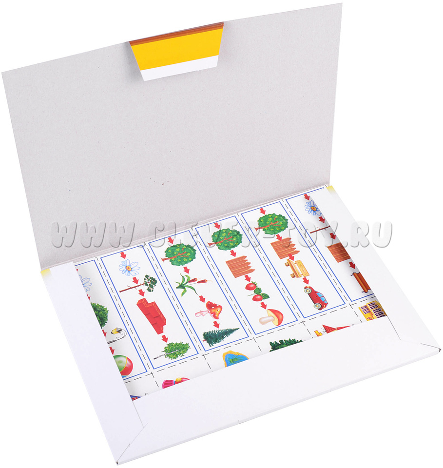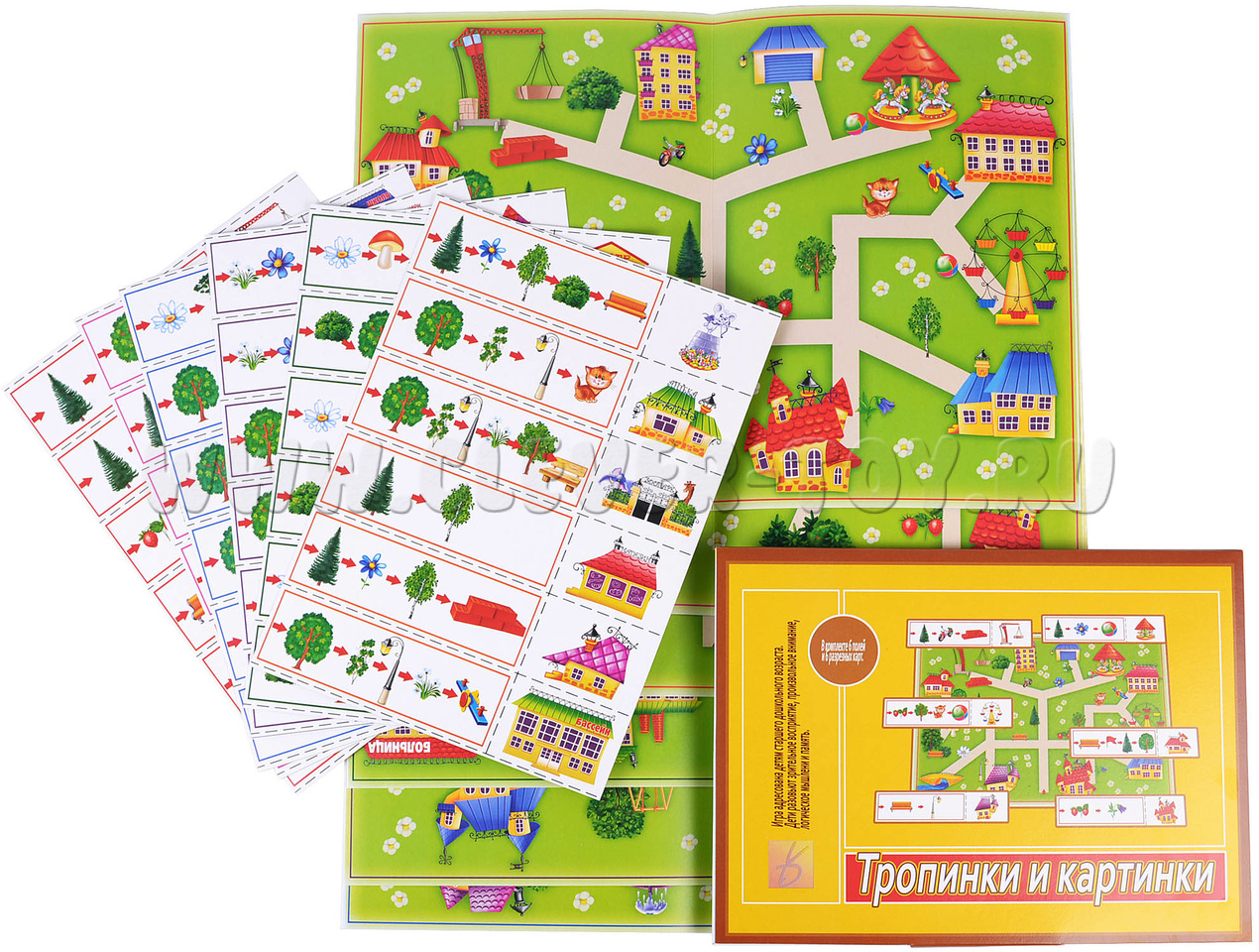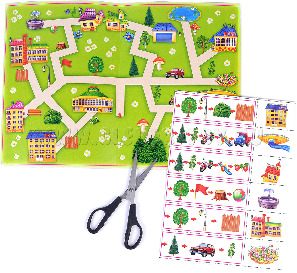 Состав набора: 6 игровых полей формата А3 (297*420 мм), 6 разрезных карт формата А4 с элементами игрового поля: 36 карточек с рисунками (здание, карусель клумба и т.д.) размером 60*45 мм; 36 карточек с тропинками, состоящими из разных ориентиров (135*45 мм).