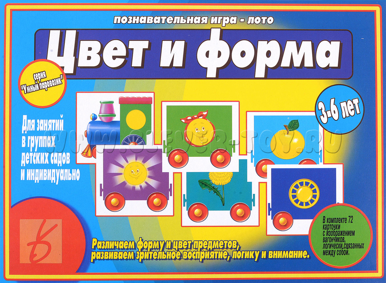 Познавательная игра-лото серии "Умный паровозик" для детей 3-6 лет, при помощи которой дети научатся различать цвет и форму предметов, разовьют зрительное внимание, логическое мышление и речь.