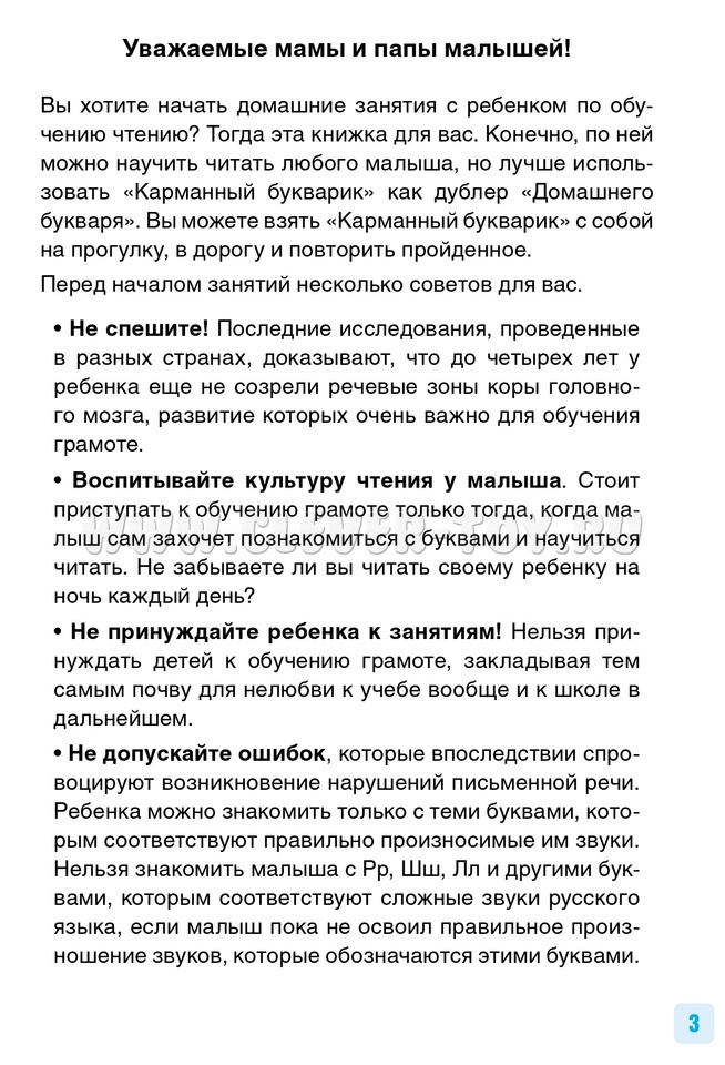При занятиях по пособию: объясните ребёнку, из каких элементов состоит каждая буква, чтобы избежать путаницы и зеркального отображения букв. Это поможет предотвратить проблемы с письмом в будущем при обучении в школе. В конце книжки вы найдёте русский алфавит с правильными названиями букв. Знакомьте детей с названиями букв только тогда, когда они начнут читать предложения и небольшие тексты. Во время знакомства с буквами называйте их звуками, которые они обозначают. Начинайте знакомство с буквами только тогда, когда ребёнок сам проявит интерес и начнёт задавать вопросы. Обучайте дошкольника грамоте в игровой форме, весело и легко