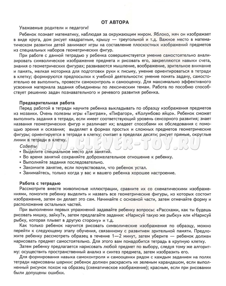 Важное место в математическом развитии детей занимают игры на составление плоскостных изображений предметов из специальных наборов геометрических фигур. При работе с данной тетрадью у ребенка совершенствуется умение самостоятельно анализировать символическое изображение предмета и рисовать его, закрепляются навыки счета, знания о геометрических фигурах; развиваются мышление, воображение, зрительное внимание и память, мелкая моторика для подготовки руки к письму, умение ориентироваться в тетради в клетку; формируются предпосылки к учебной деятельности: умение понять задачу, самостоятельно ее выполнить, провести самоконтроль и самооценку.