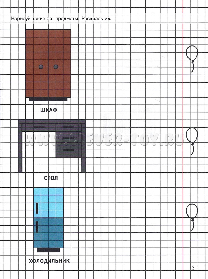 Для формирования навыка самоконтроля и самооценки рядом с каждым заданием на полях тетради нарисованы шарики: ребенок должен раскрасить их зеленым карандашом, если выполненный рисунок похож на образец (схематическое изображение); красным, если при рисовании были допущены ошибки.