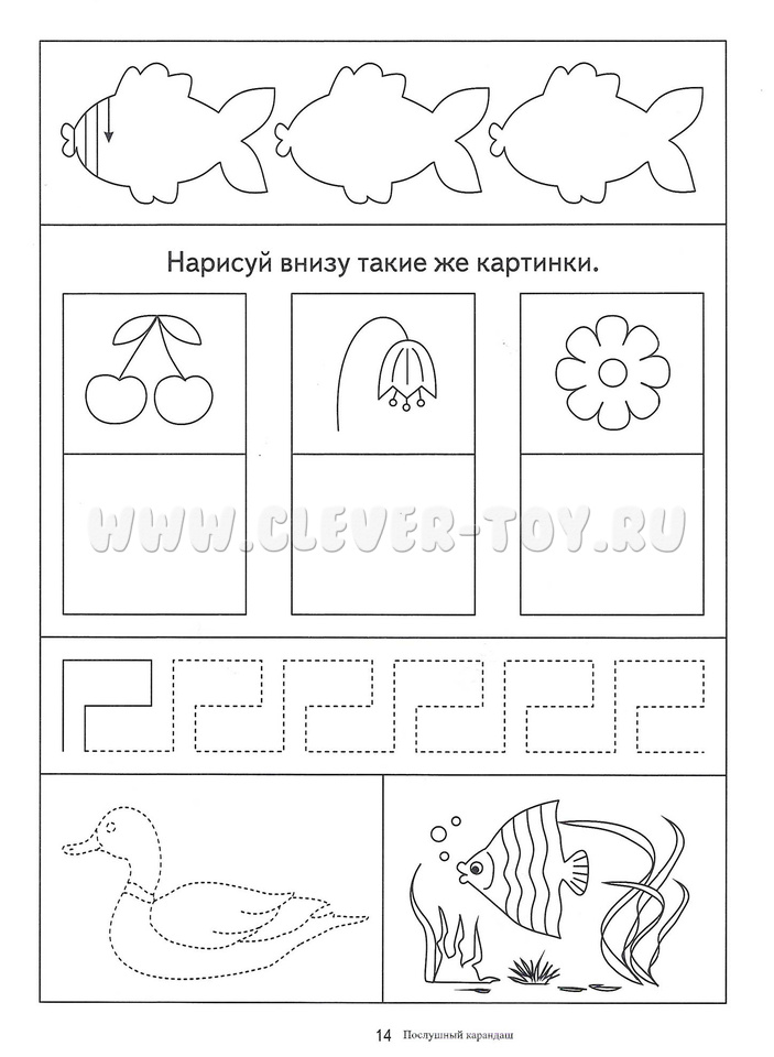 Внутри вы найдете такие задания как: штриховка по образцу, продолжи узор, обведи по точкам, раскрась картинку, нарисуй точно такой же рисунок, дорисуй вторую половину.
