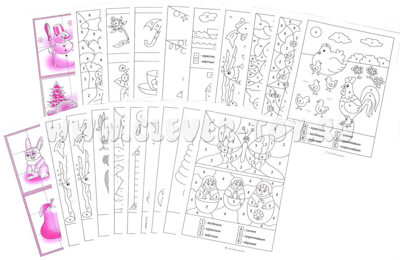 Внутри имеются цветные вкладыши, перед игрой картинки необходимо разрезать по пунктирным линиям. Части каждой игры сложите в конверт, чтобы они не перепутались. Предложите ребенку новую игру - собрать пазлы (части картинки).
