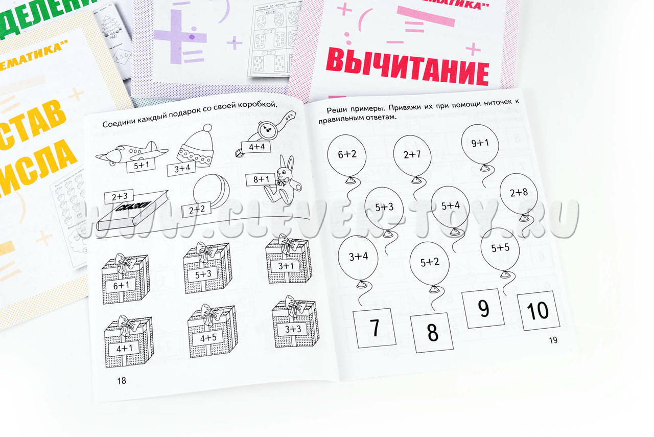 В состав комплекта входит 8 тетрадей, каждая из которых посвящена определенному математическому умению дошкольника. В тетрадях по 32 страницы.