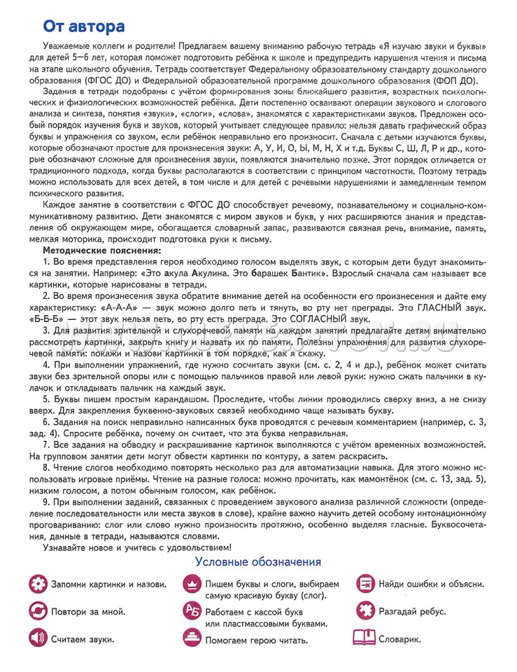 Дети постепенно осваивают операции звукового и слогового анализа и синтеза, понятия "звуки", "слоги", "слова", знакомятся с характеристиками звуков. Предложен особый порядок изучения букв и звуков, который учитывает следующее правило: нельзя давать графический образ буквы и упражнения со звуком, если ребёнок неправильно его произносит.
